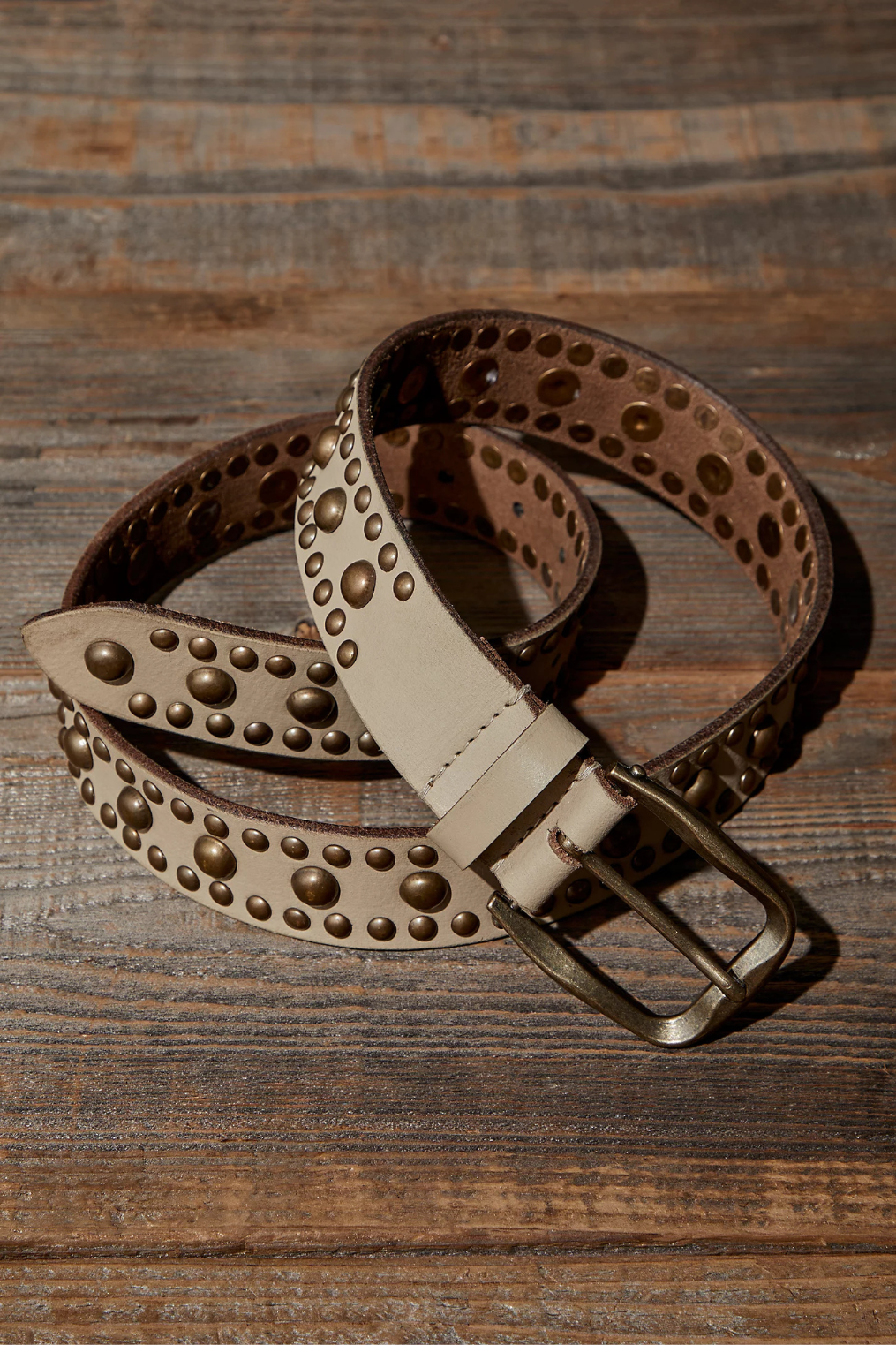 Studded off white leather belt with rounded stud details.