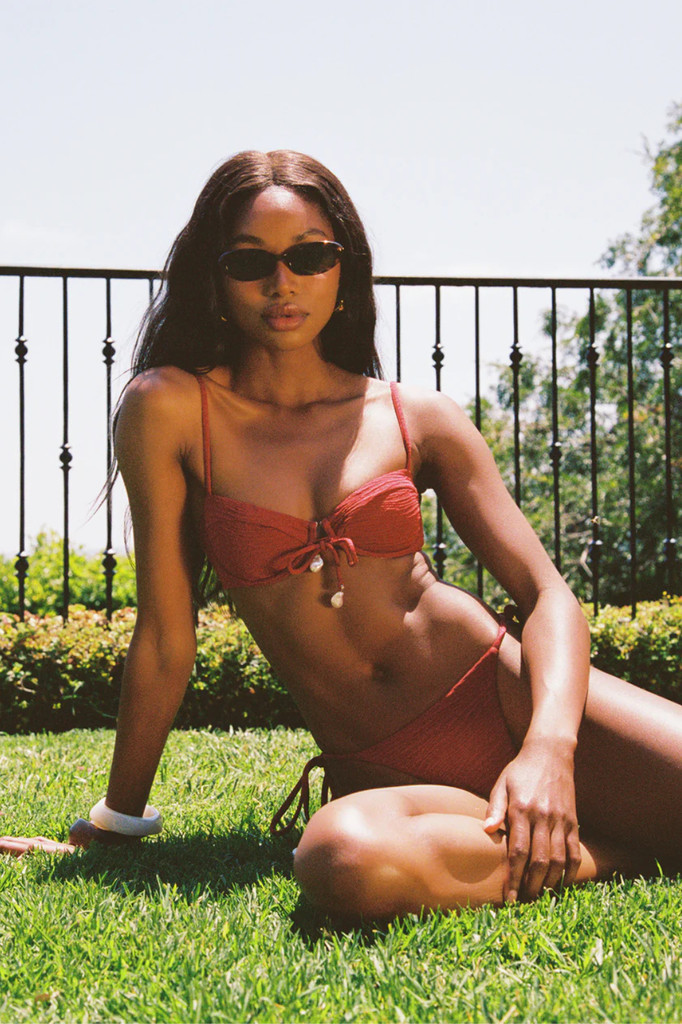 Red sting bikini bottoms in a luxe jacquard fabric.
