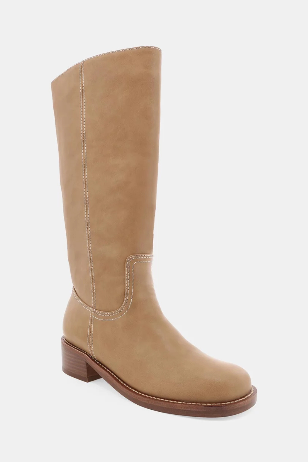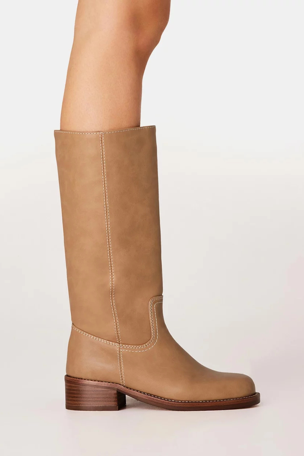 Beige knee-high structured boot with a chunky flat rubber sole.