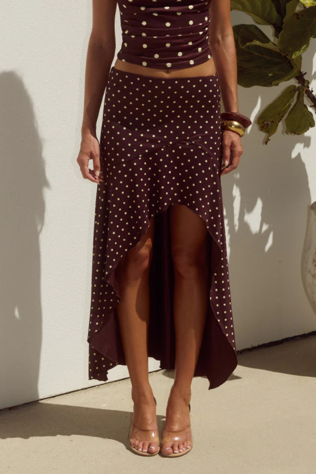 Flounce brown and yellow polka dot mini skirt.