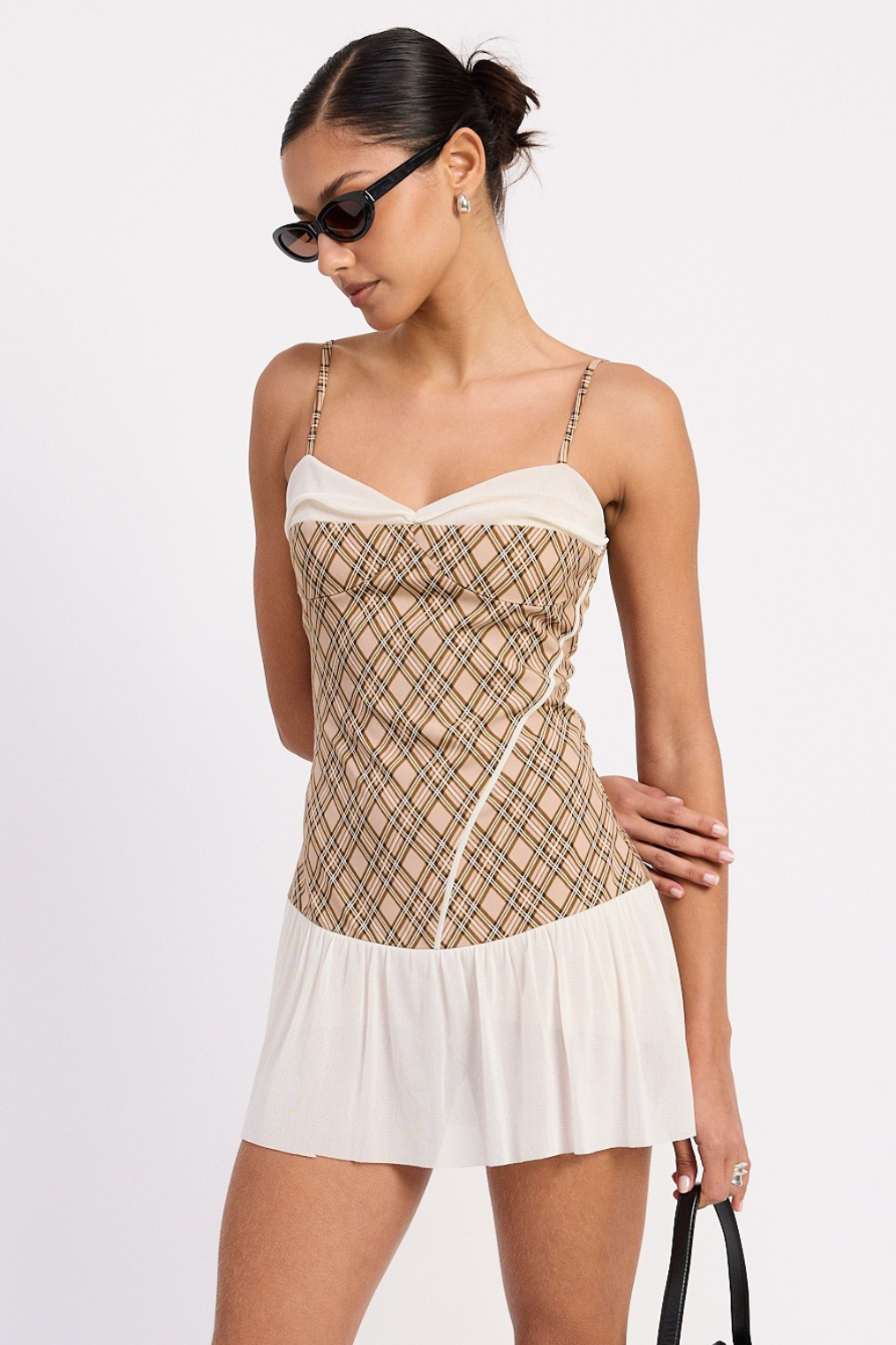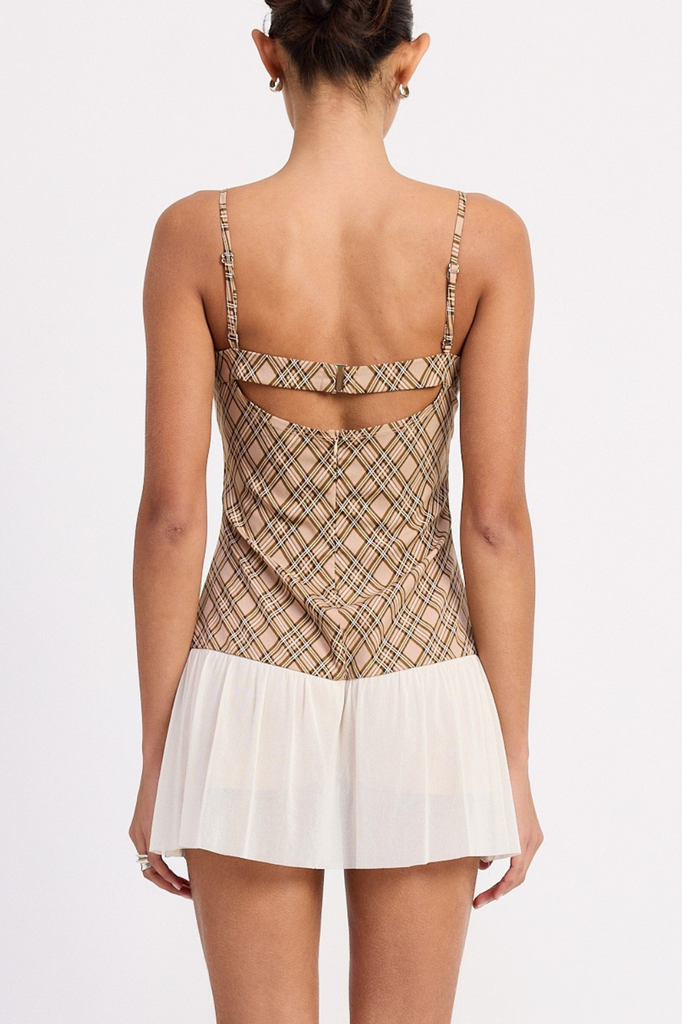 Plaid ruched mini dress with contrast trim.