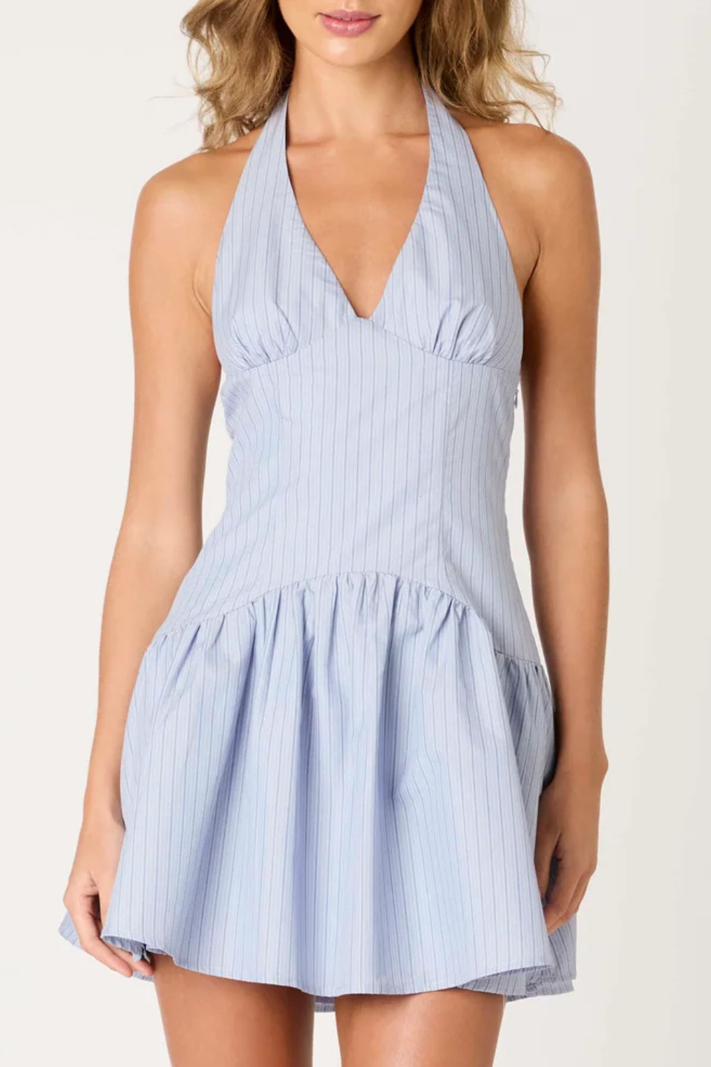 Pinstripe halter mini dress.