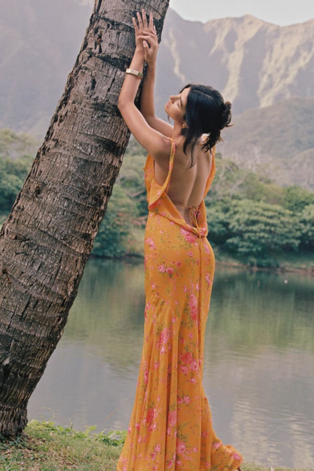 Orange floral maxi dress made in a lightweight crepe fabric.
