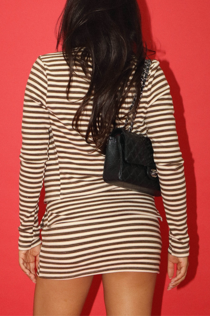 Chocolatey brown, tan, and beige striped skort.