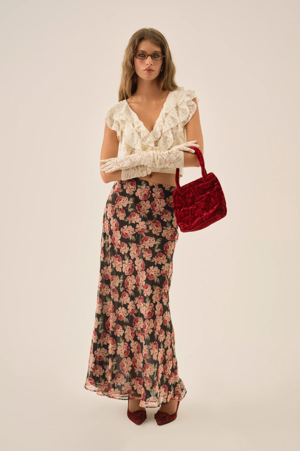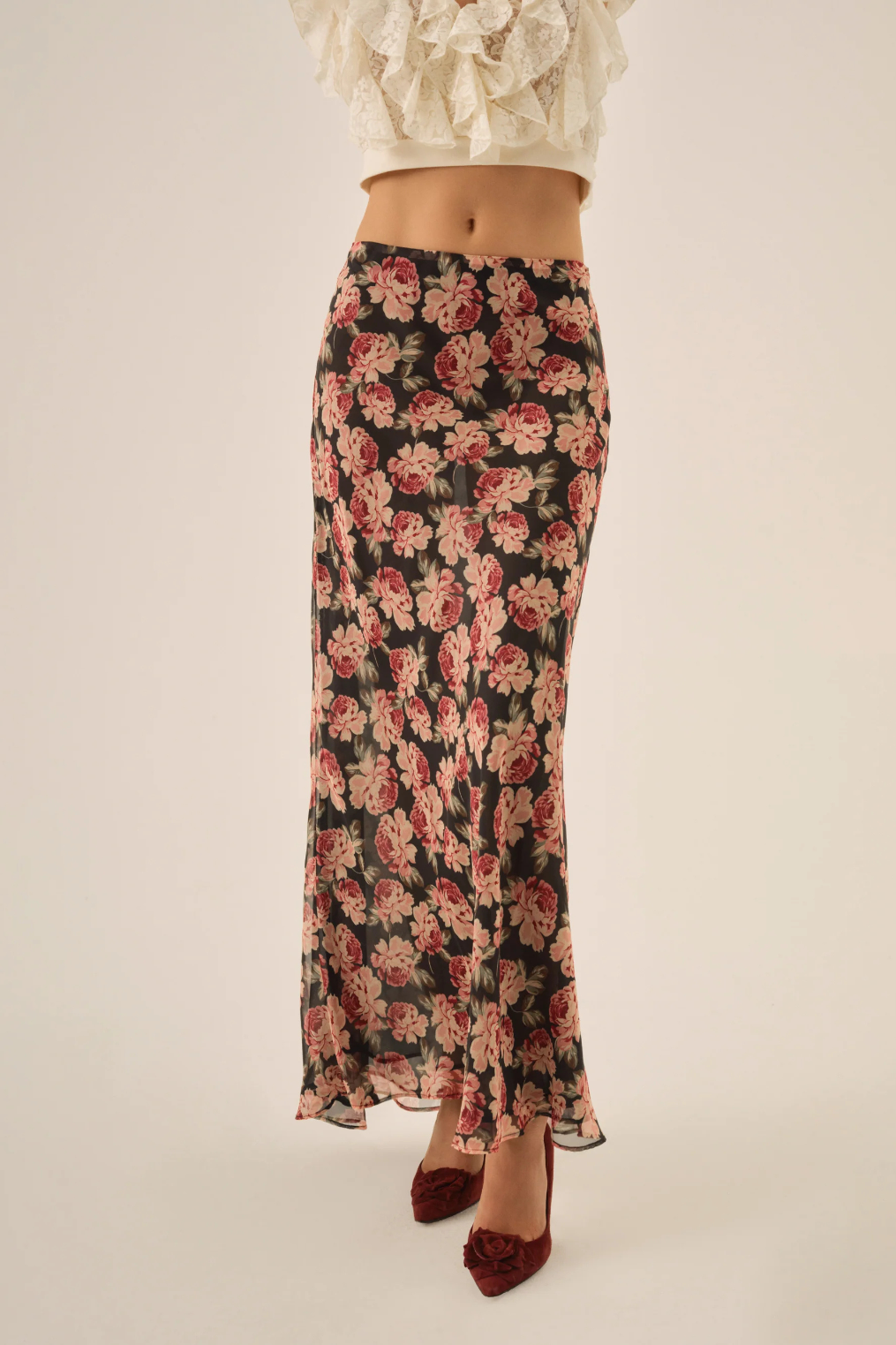 Bias cut floral chiffon maxi skirt.