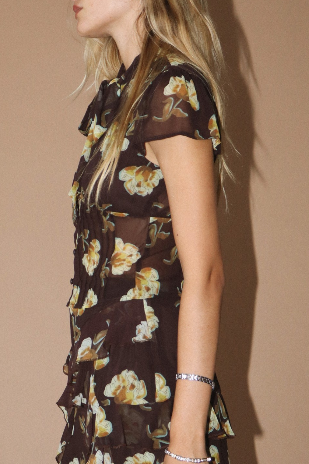 Chocolate brown floral corset style blouse with tie accent at neck.
