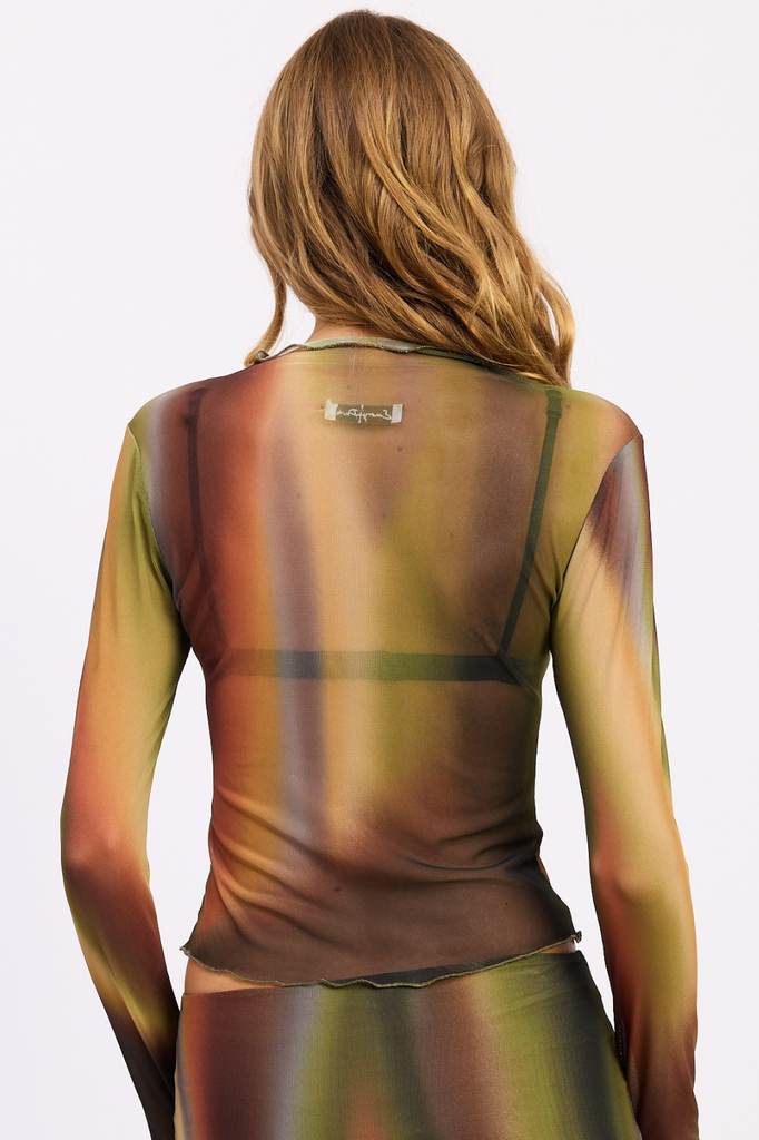 Mesh long sleeve mock neck top.