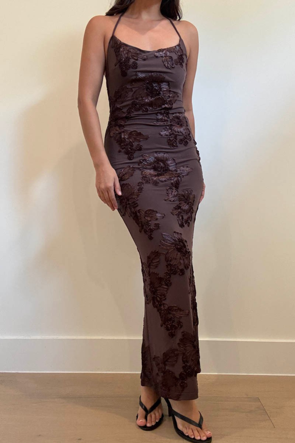 Brown mesh maxi dress with tonal satin floral accents.