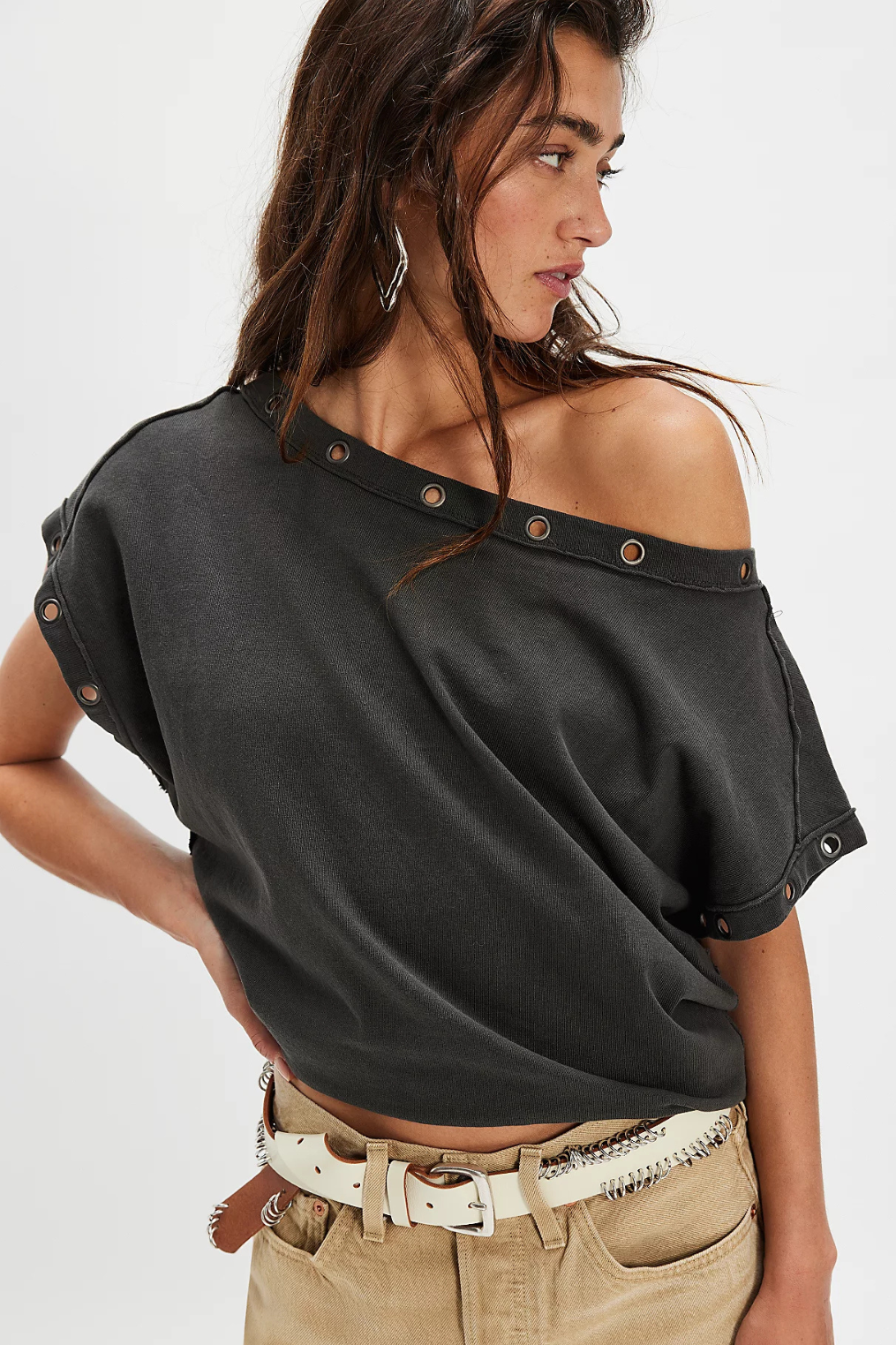 Vintage faded black off-the-shoulder tee with grommet embellishments.