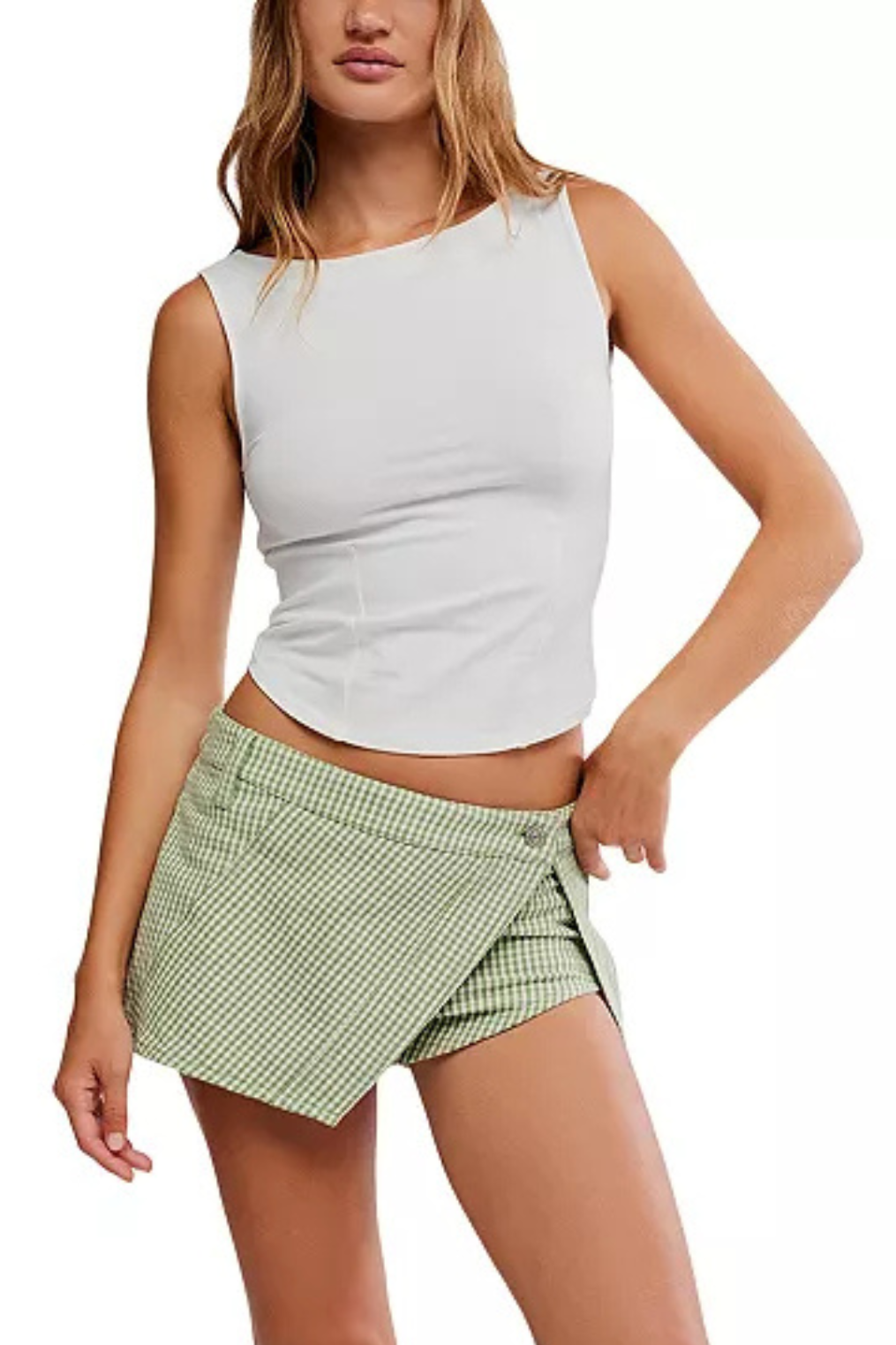 Light green gingham micro skort with side button closure.