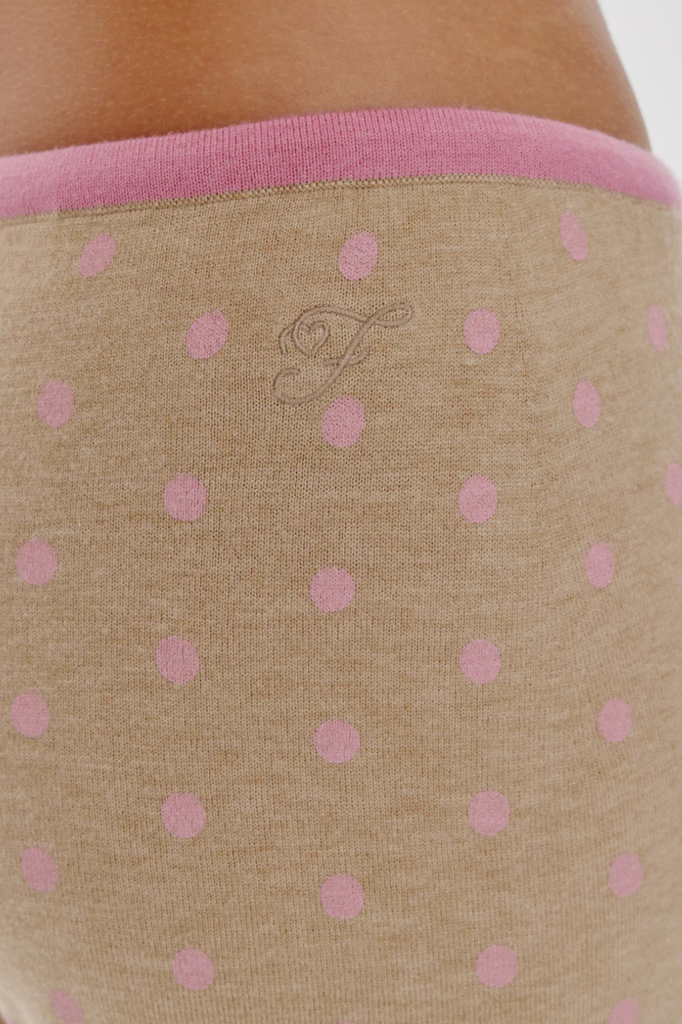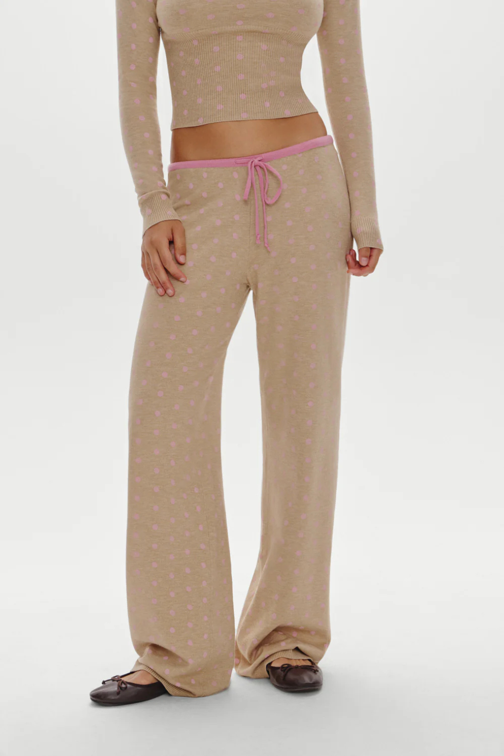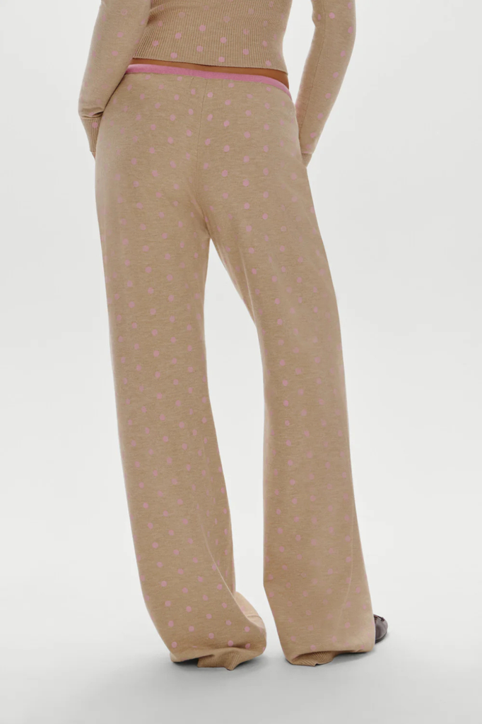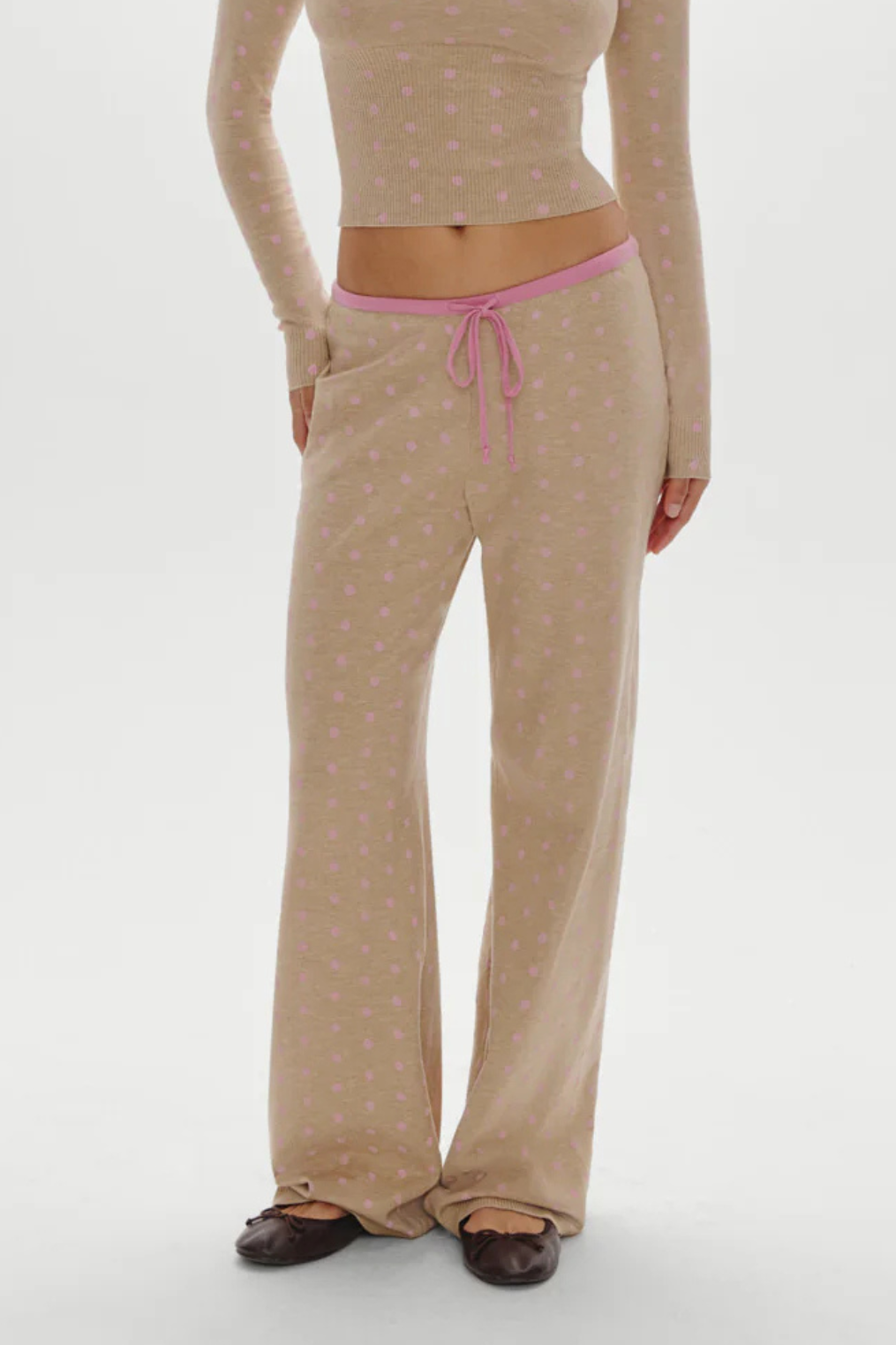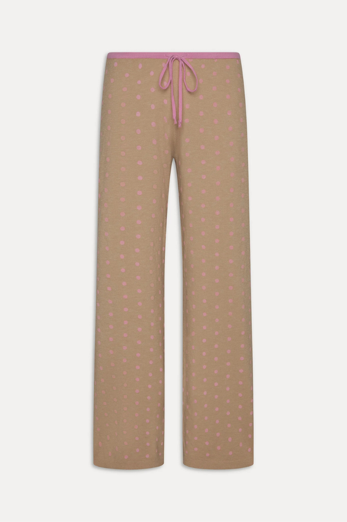 Tan and pink polka dot cloud knit drawstring lounge pants.