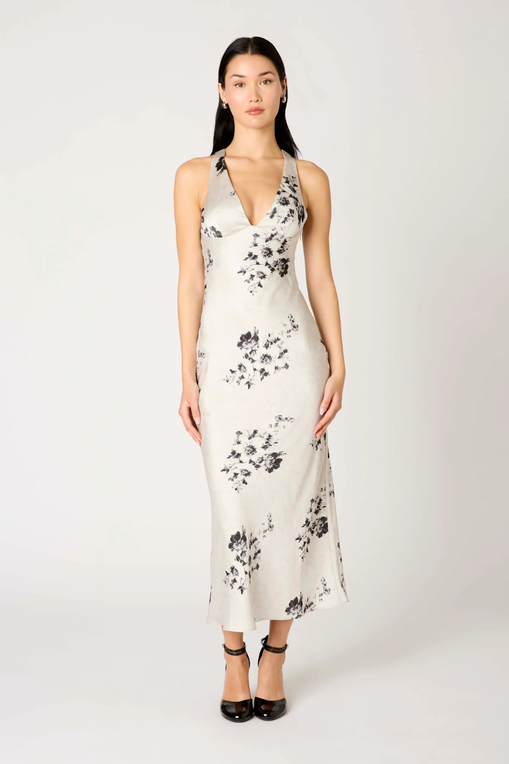 Timeless off-white bias cut satin floral midi dress with black floral print.