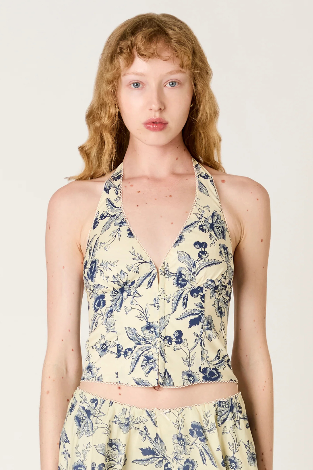 Structured poplin halter corset in a navy blue floral print.