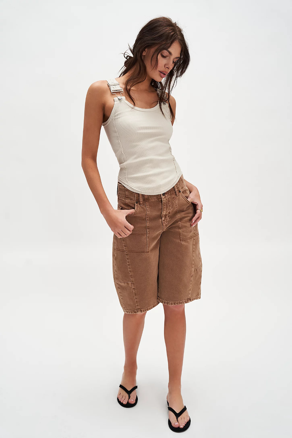 Classic ribbed tank with overall-inspired shoulder strap hardware.