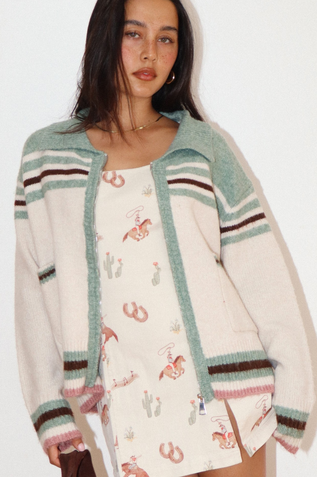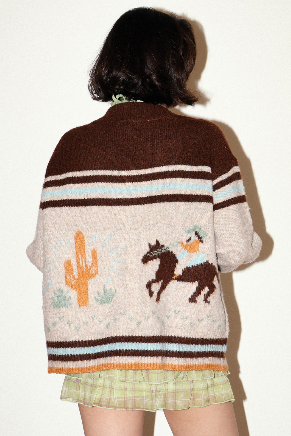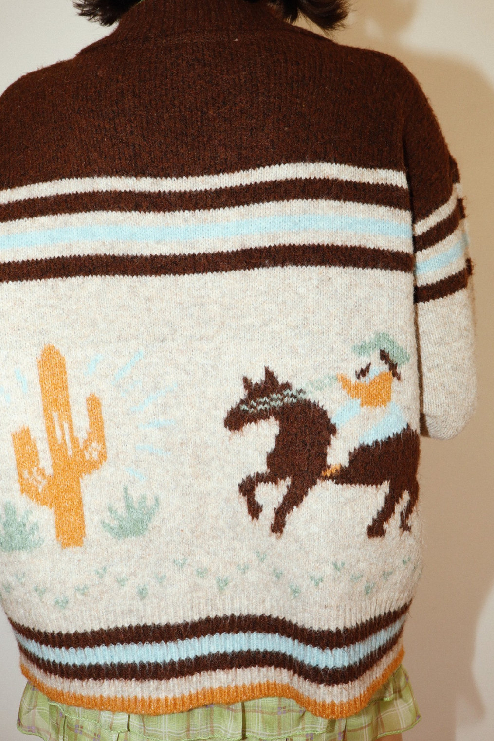 Cozy knit cardigan with western cowgirl graphic on back.