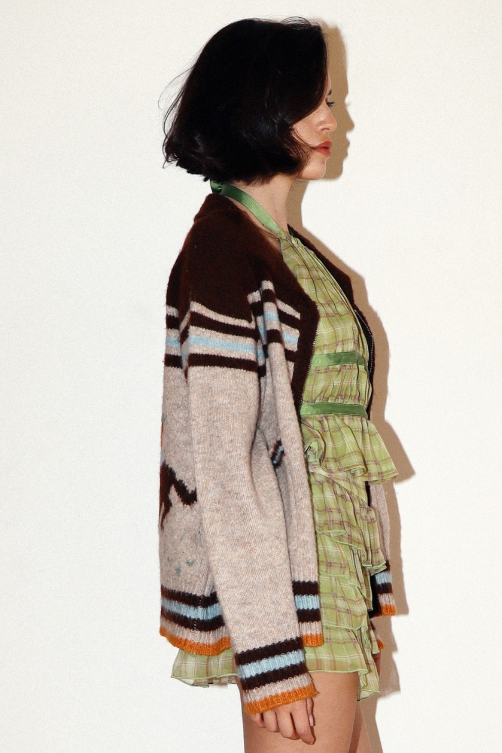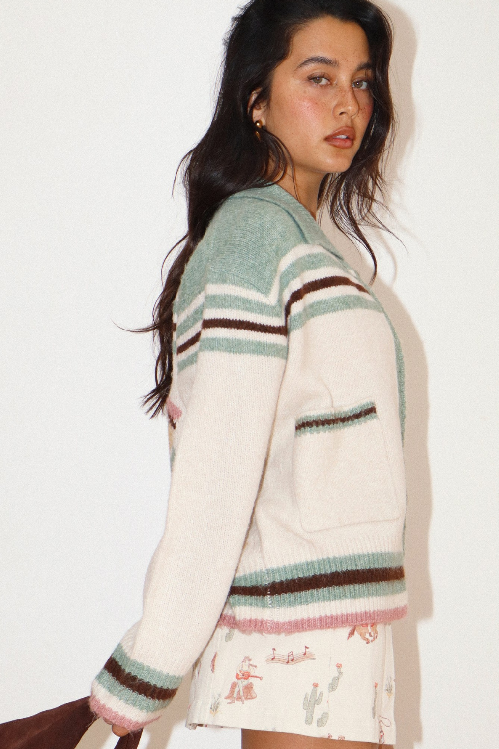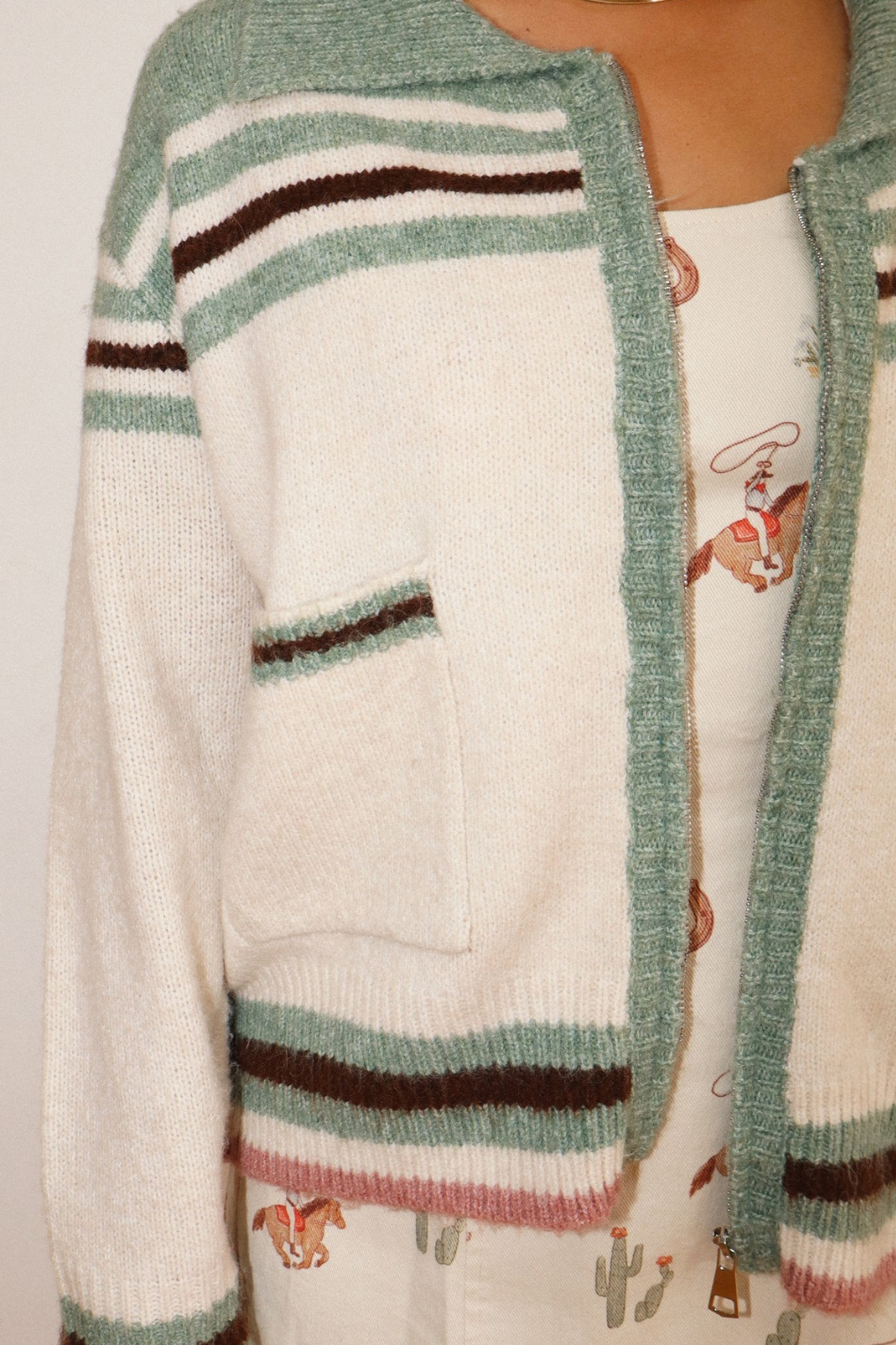 Cozy knit cardigan with western cowgirl graphic on back.