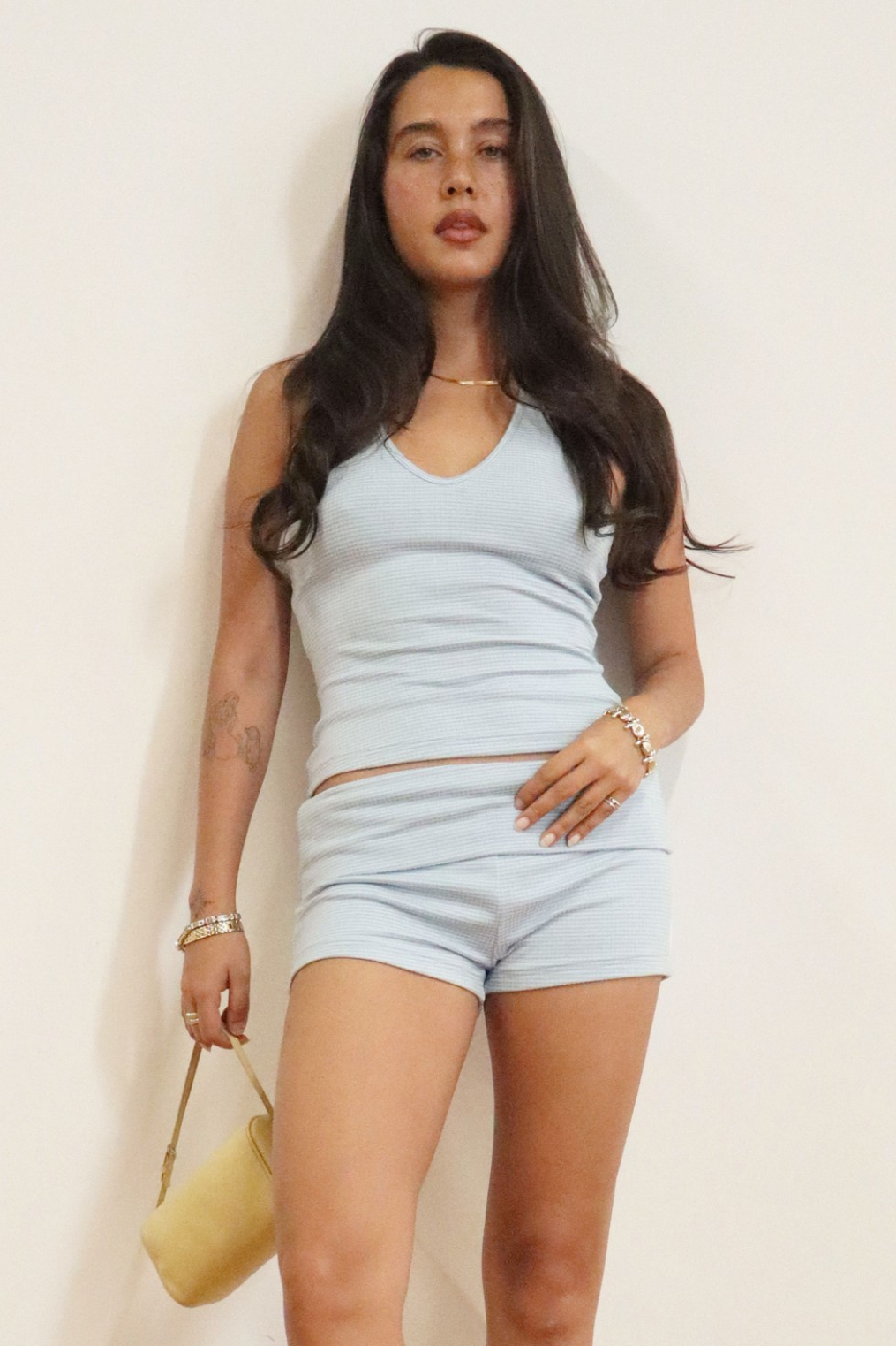 Waffle knit stretch bodycon fit light blue halter tank.