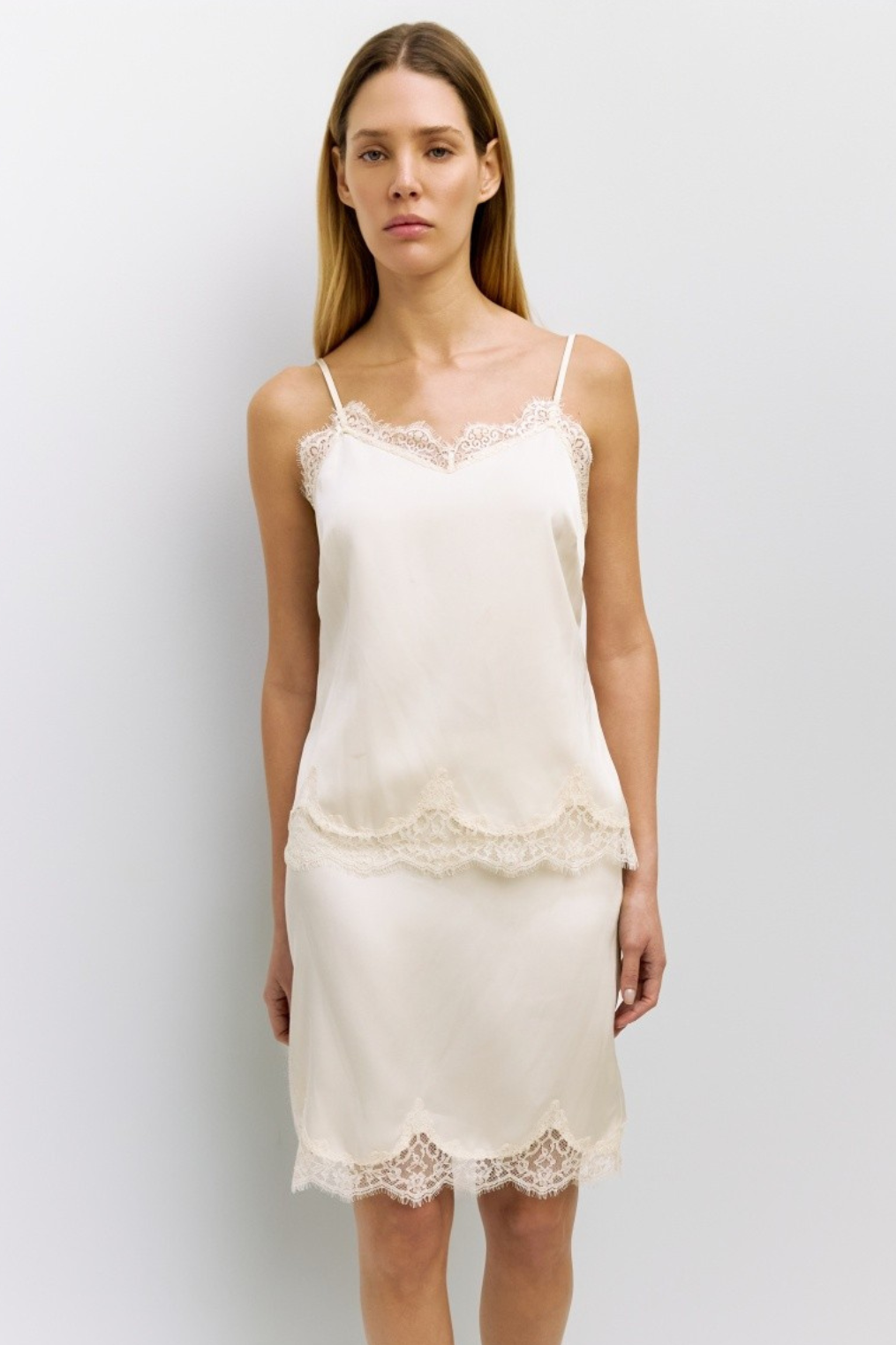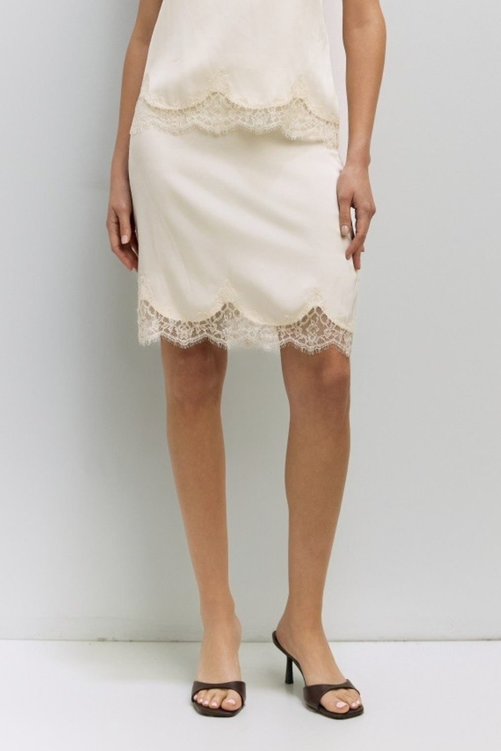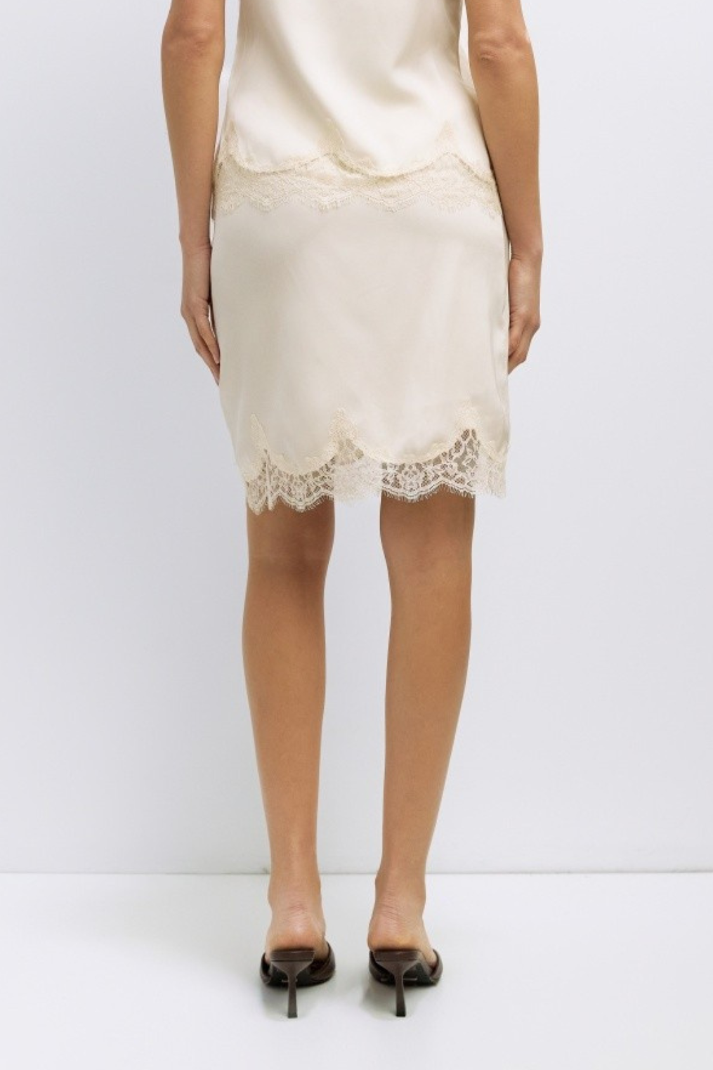 Midweight satin relaxed-fit skirt with lace trimming.