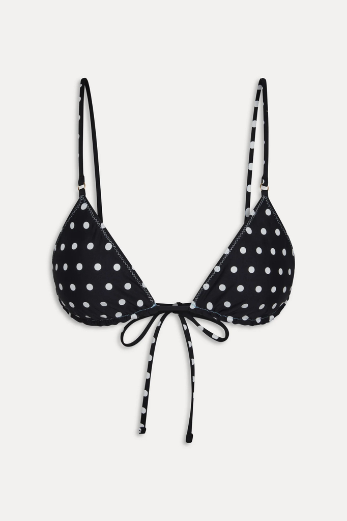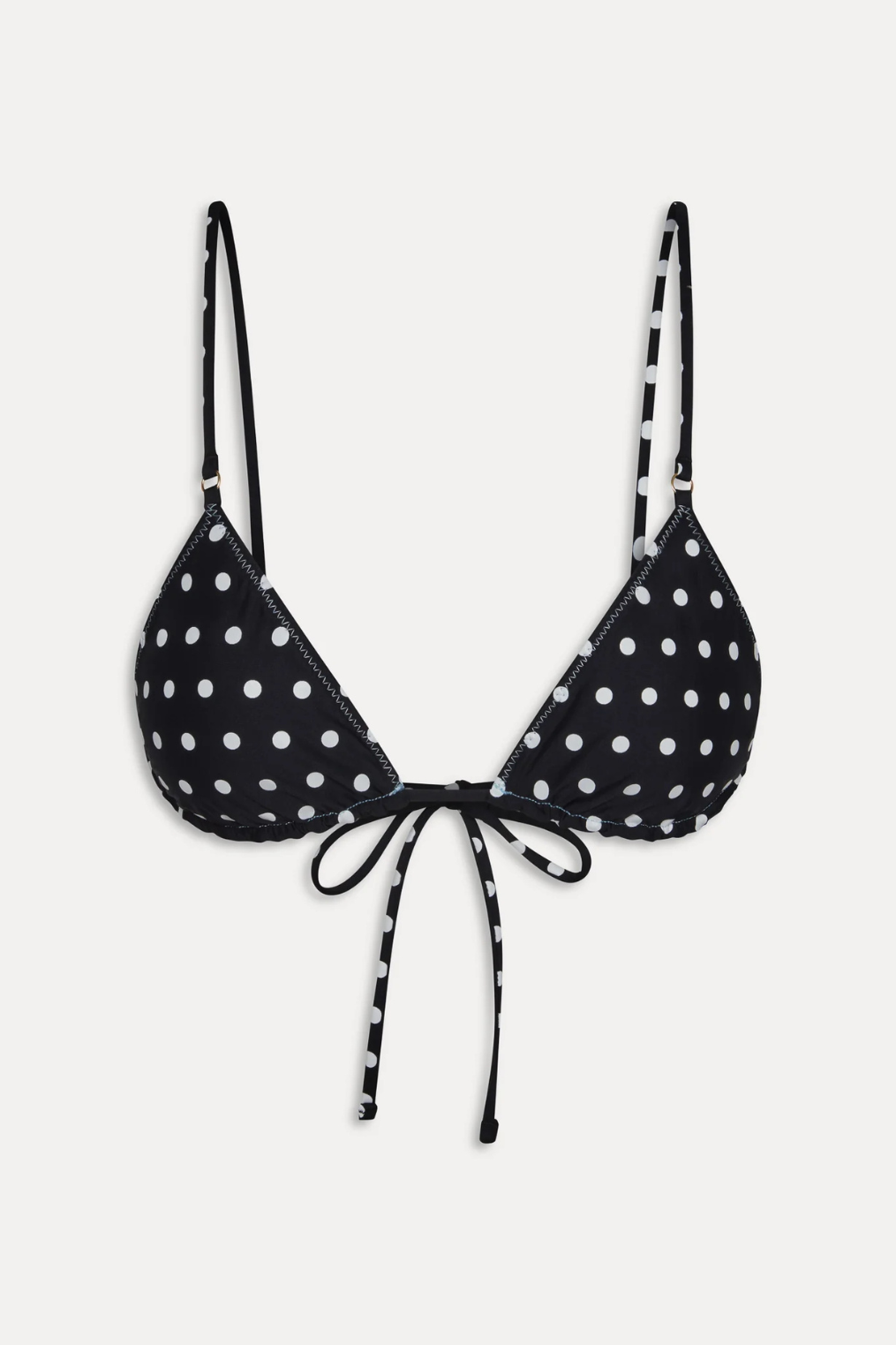 Reversible baby blue to black with white polka dot micro triangle bikini top.