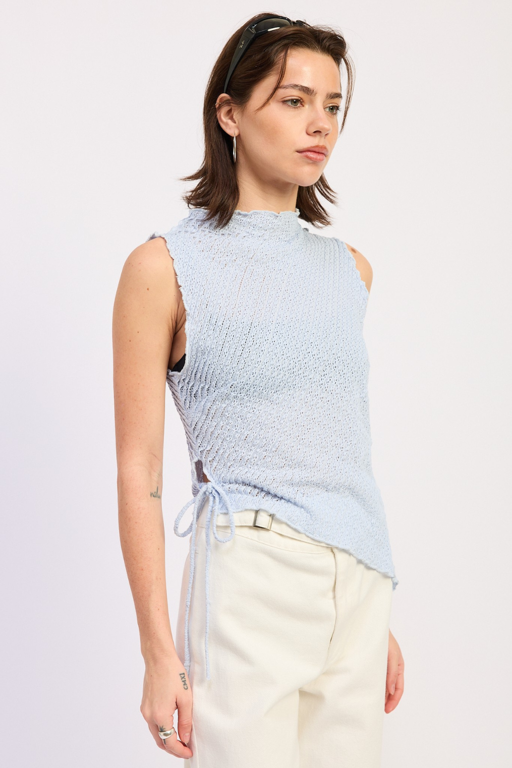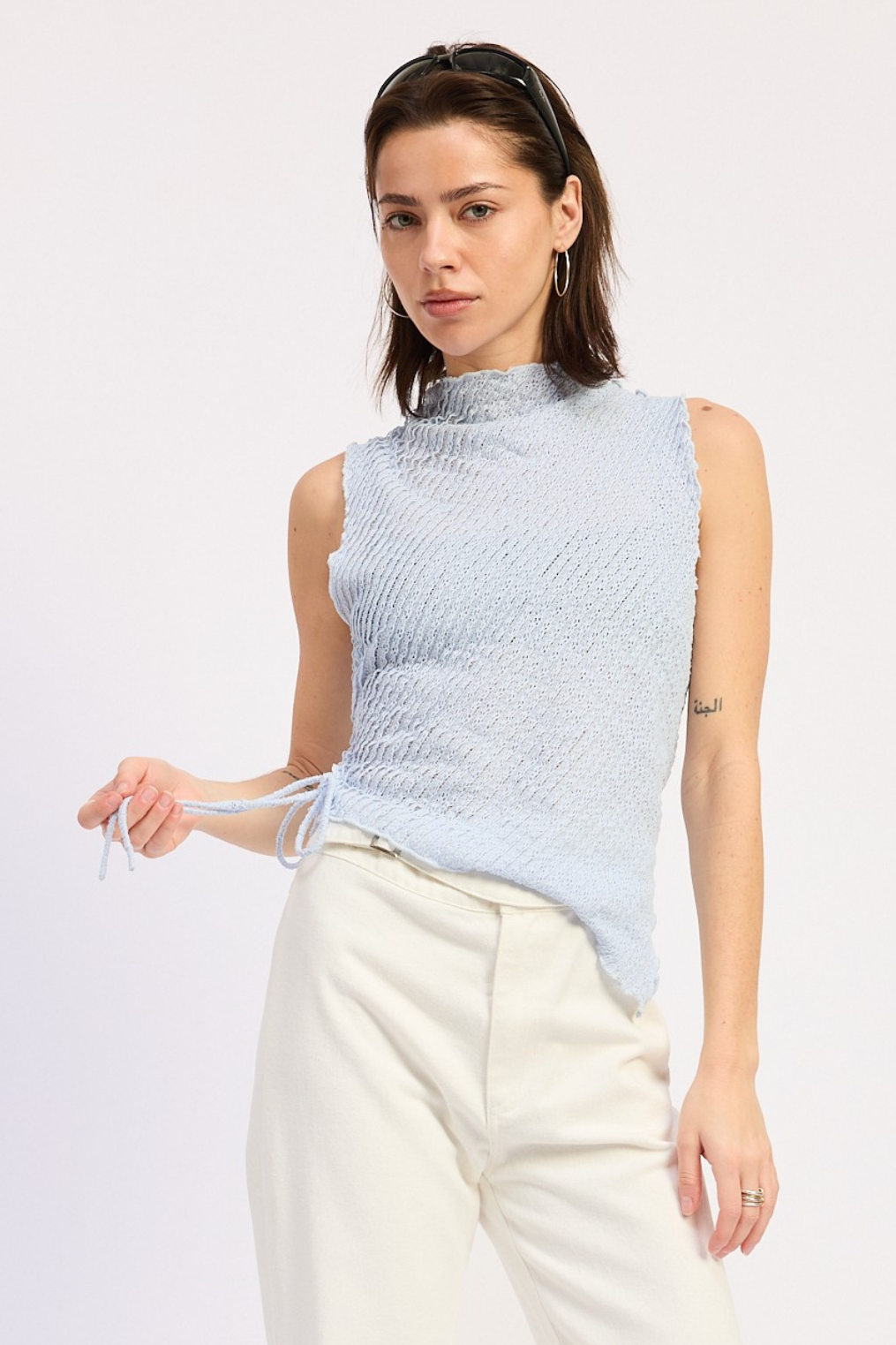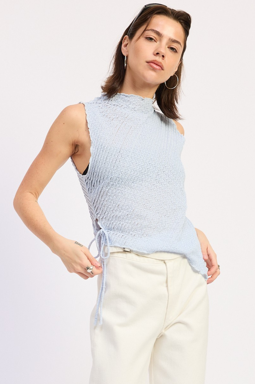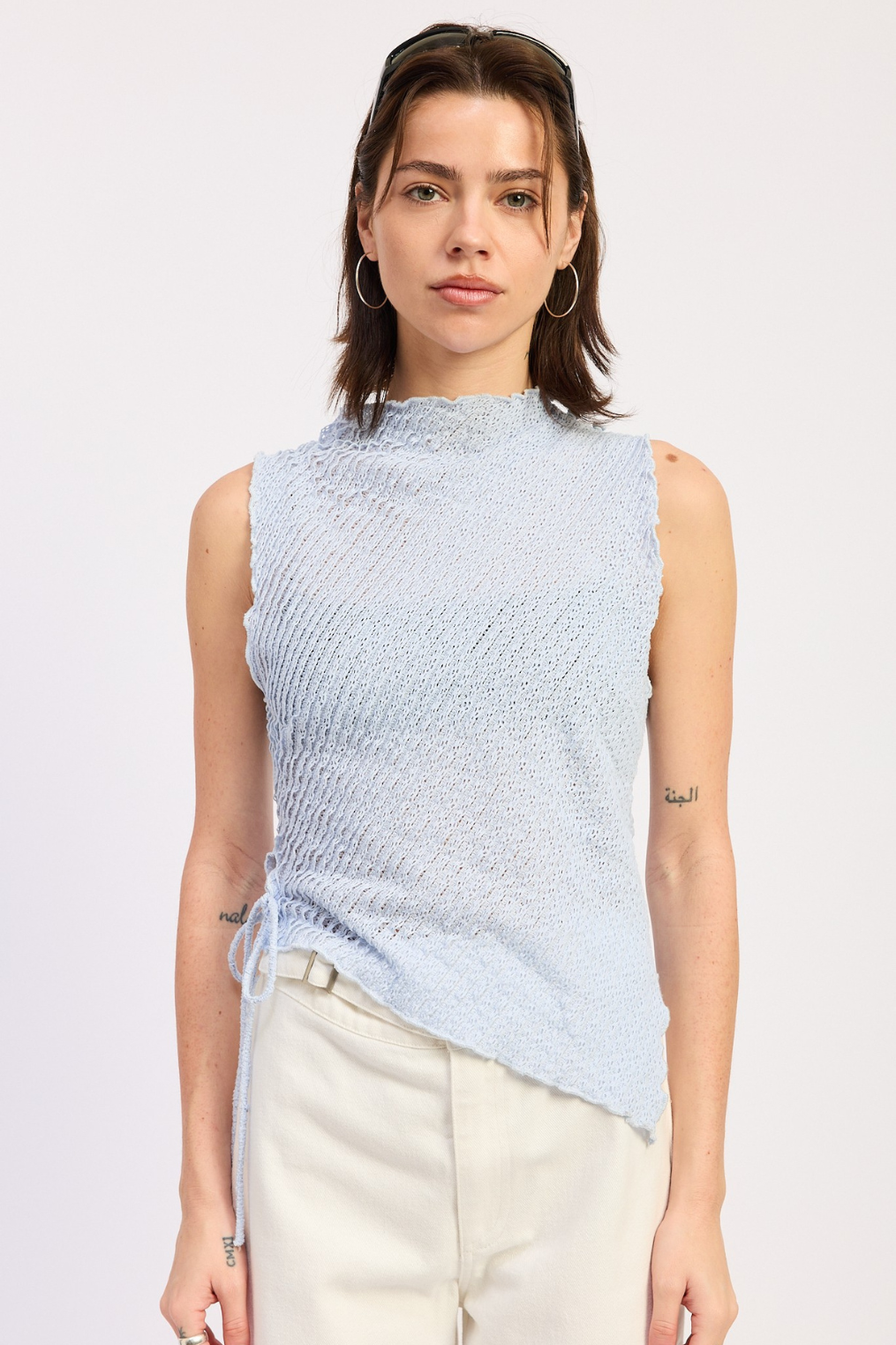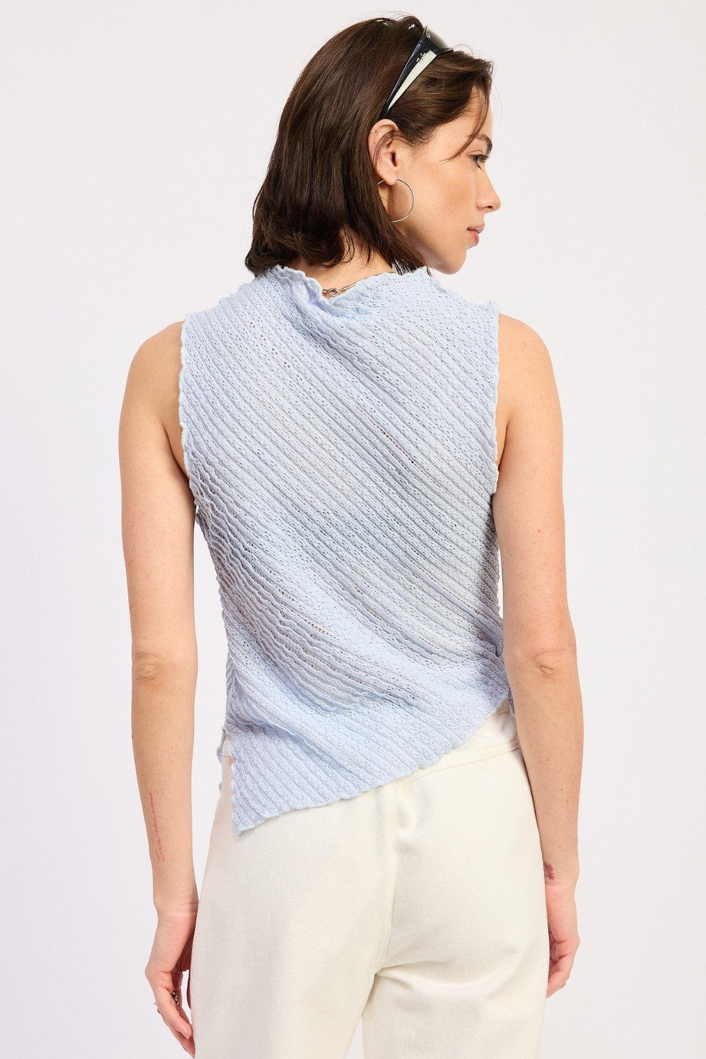 Mock neck sleeveless baby blue textured asymmetrical mesh top.
