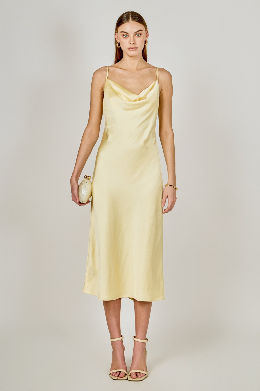 Satin yellow midi slip dress.