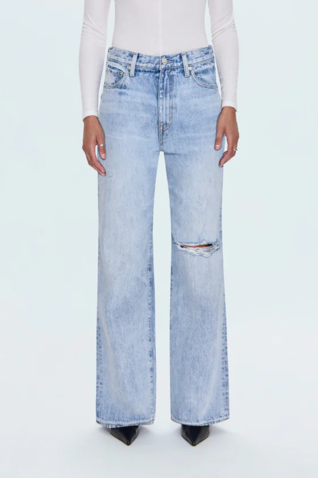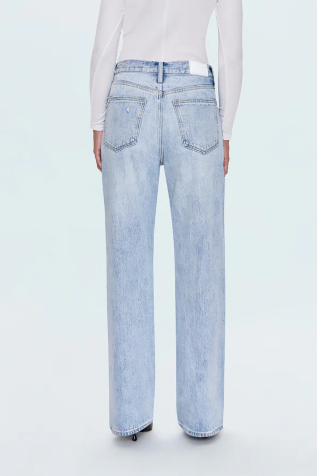 High rise baggy jeans in a worn, faded light blue denim wash.