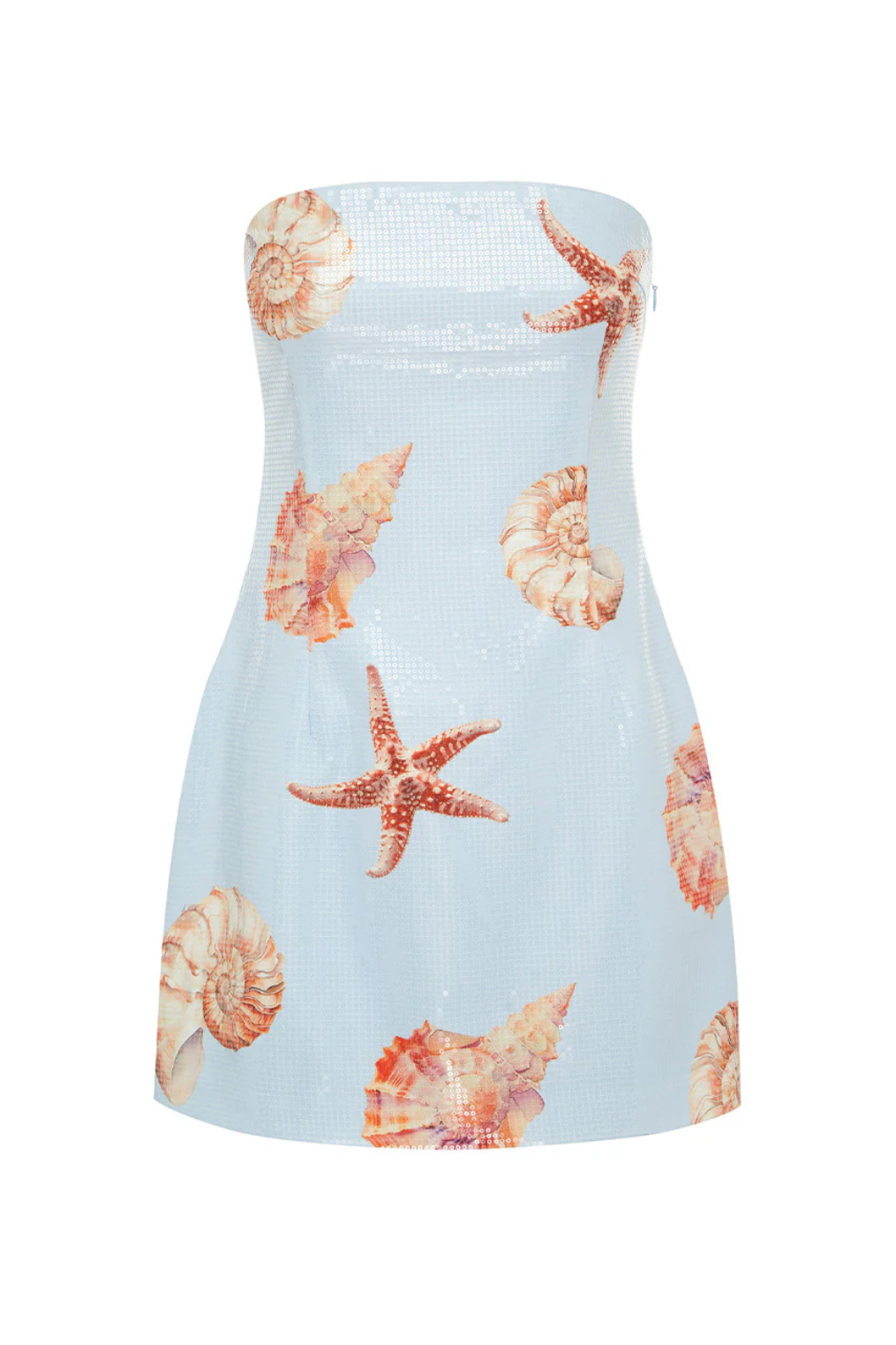 Light blue seashell print mini dress covered in a clear sequin overlay.