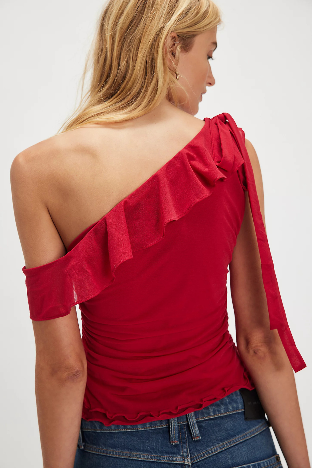 Ruby red off-the-shoulder asymmetrical ruffled top.