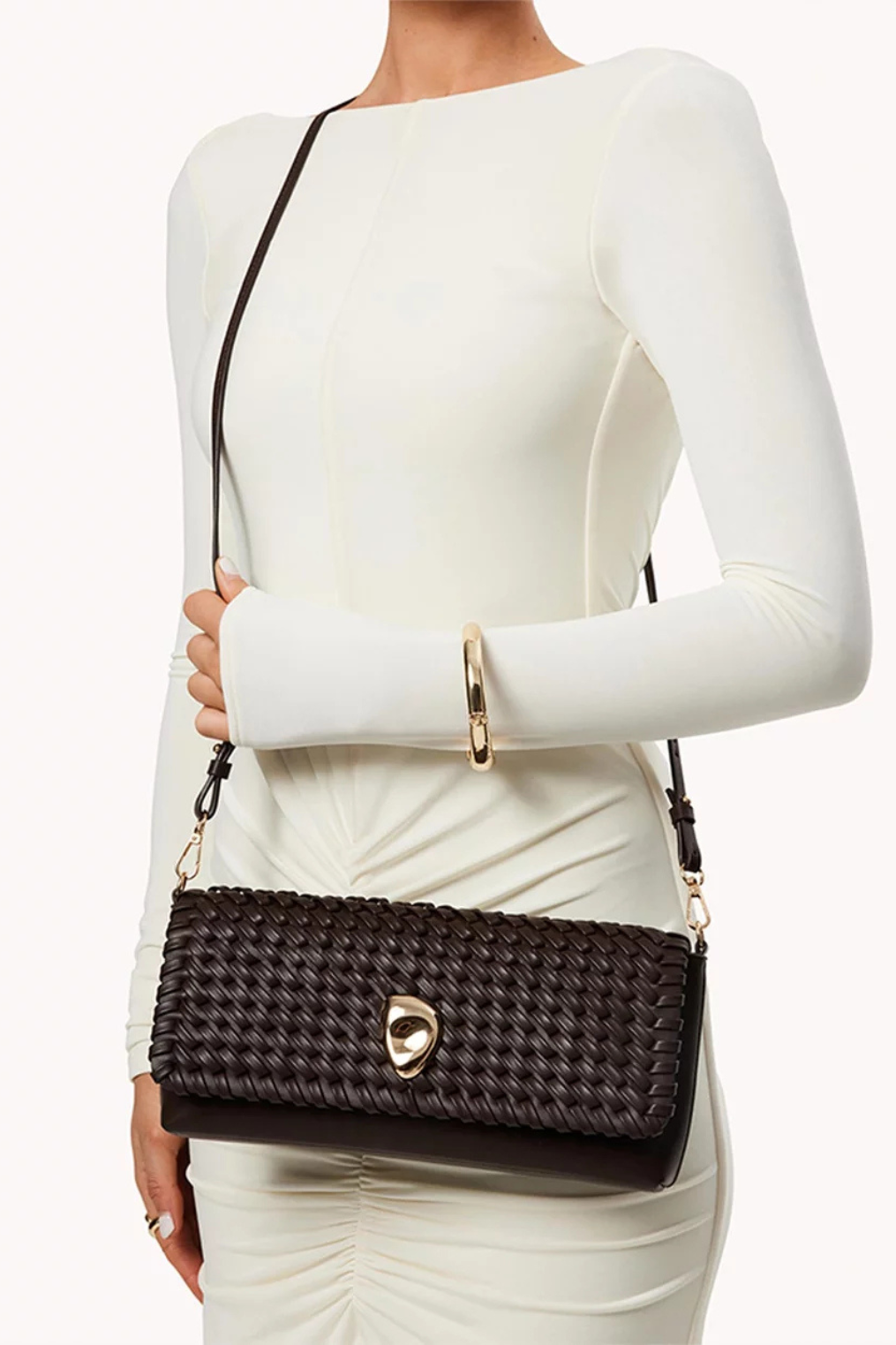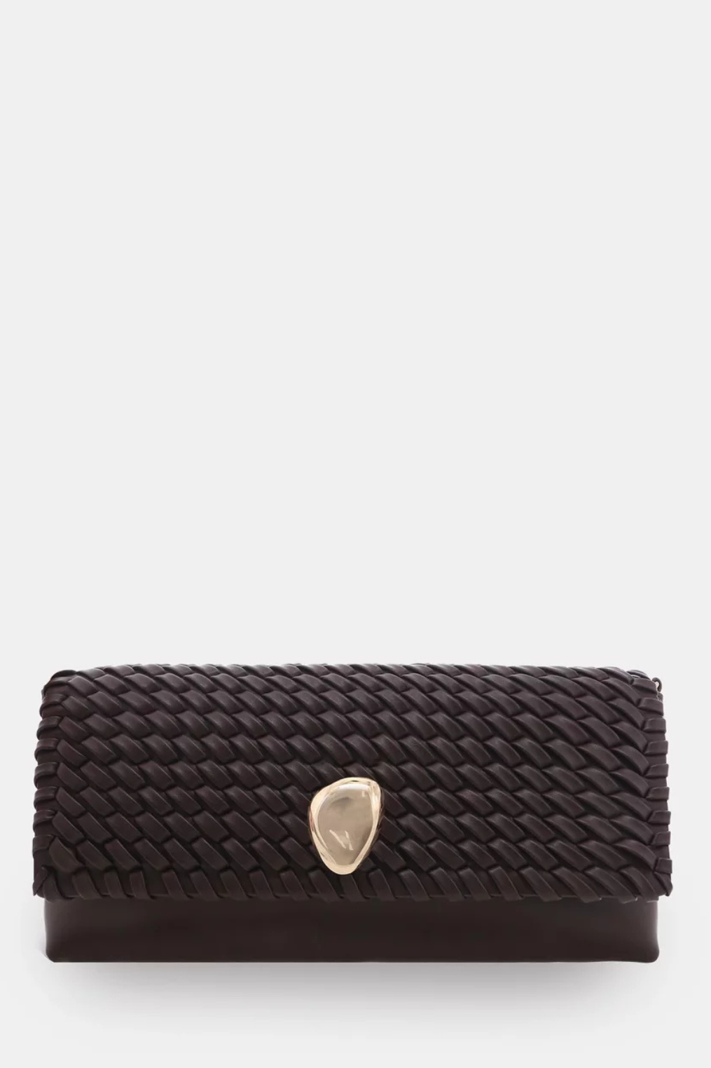 Dark brown woven faux leather clutch to shoulder bag.