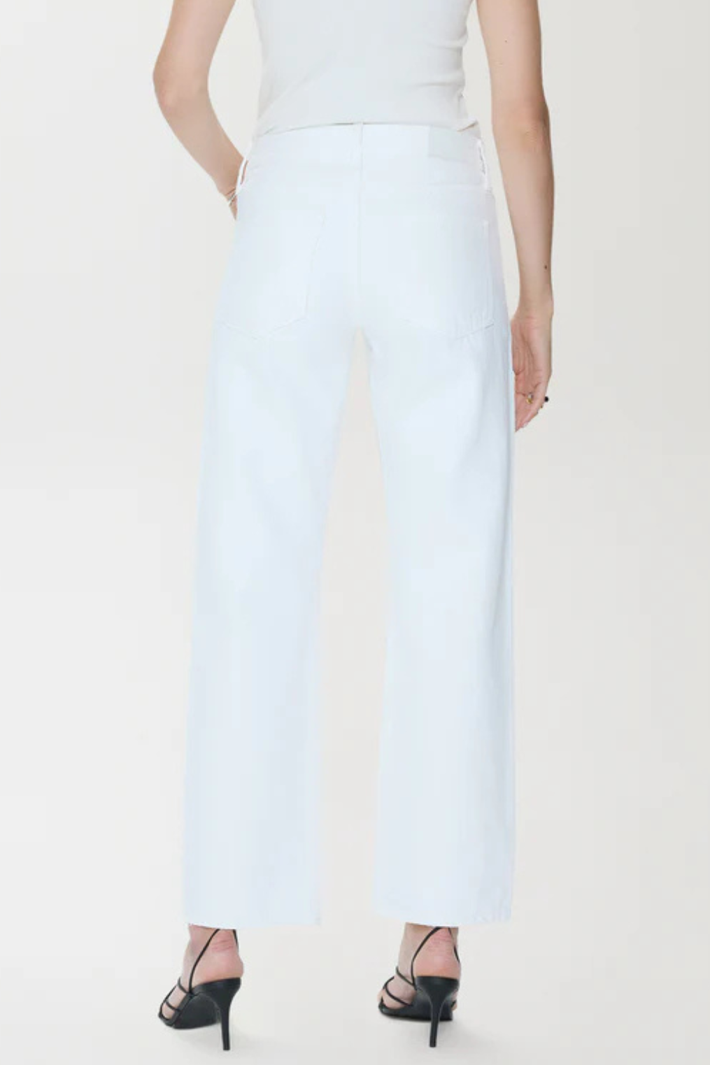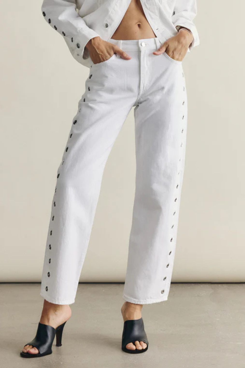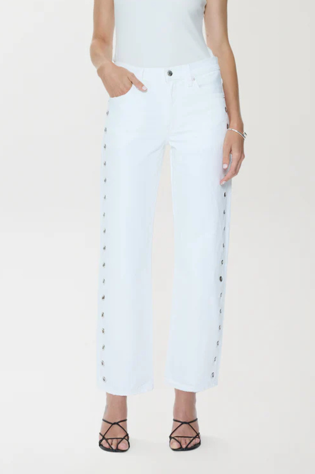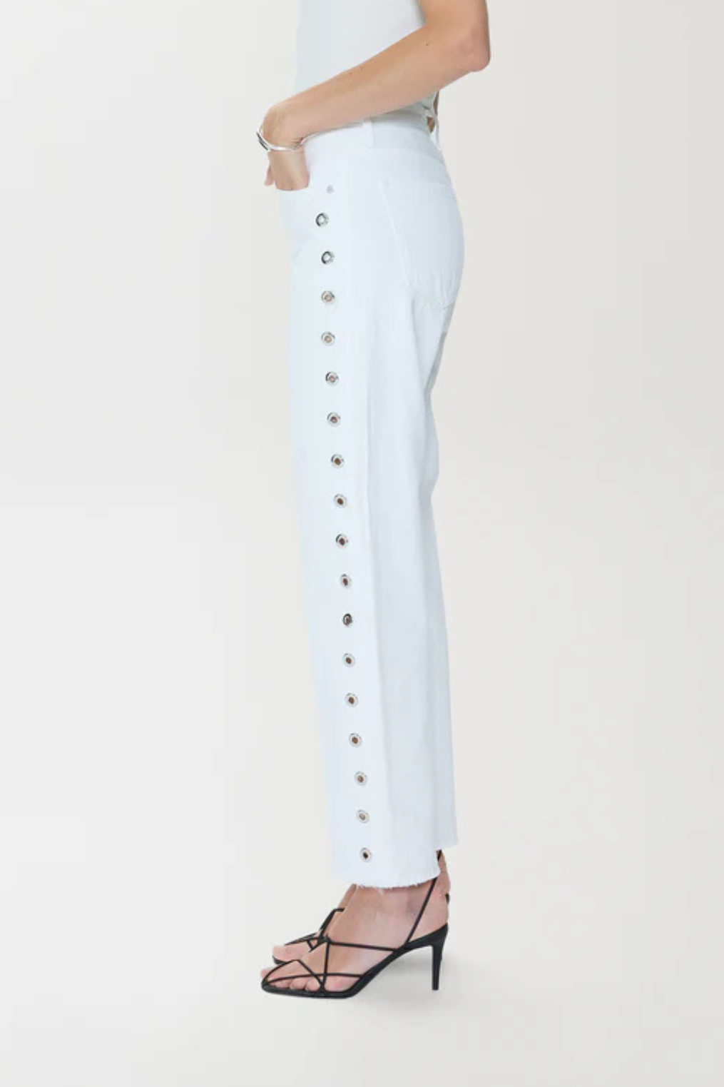 Bright white bowed leg mid-rise jeans with grommets along each side.
