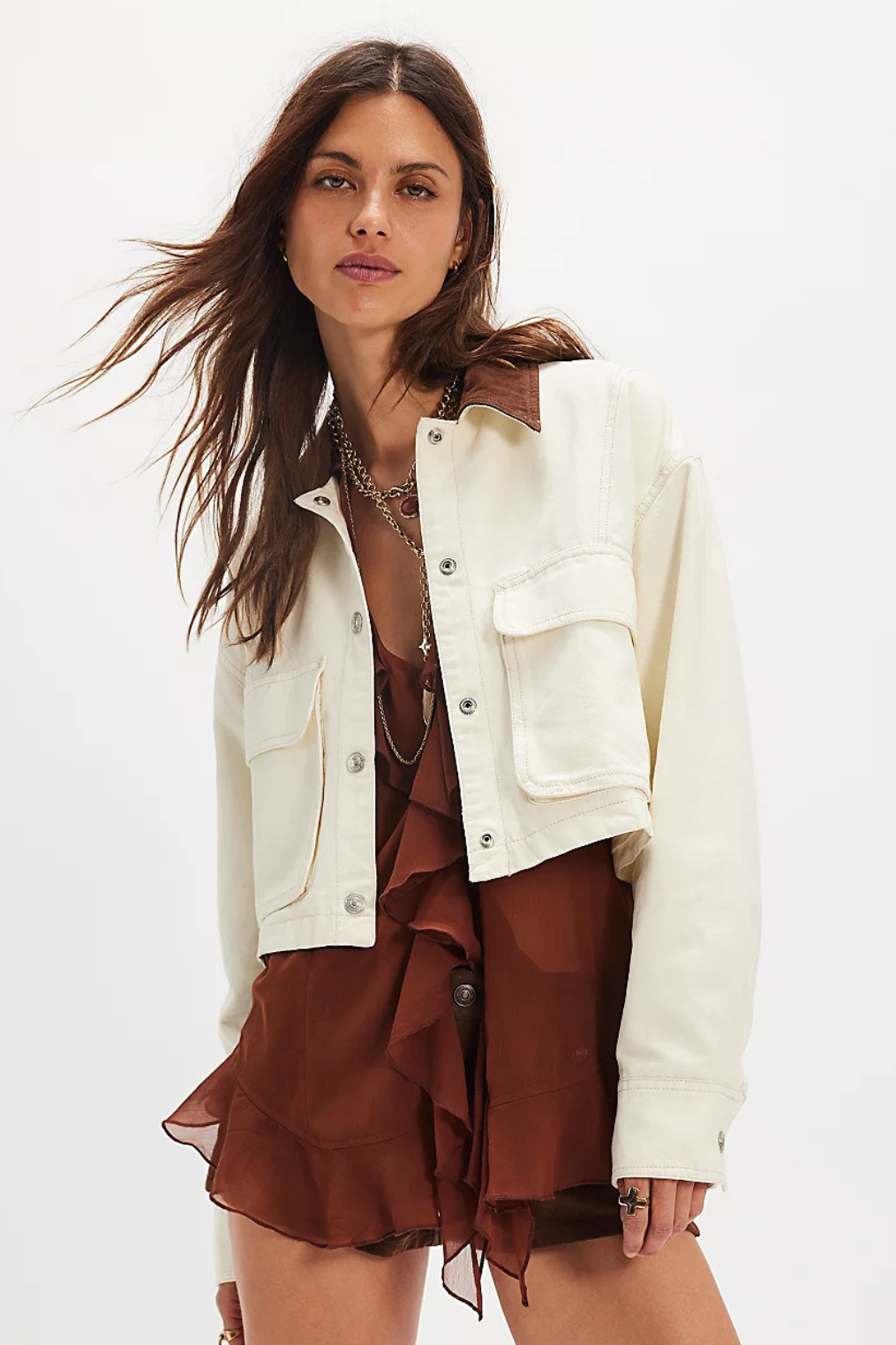 Cropped cream colored workwear jacket with exaggerated pockets.