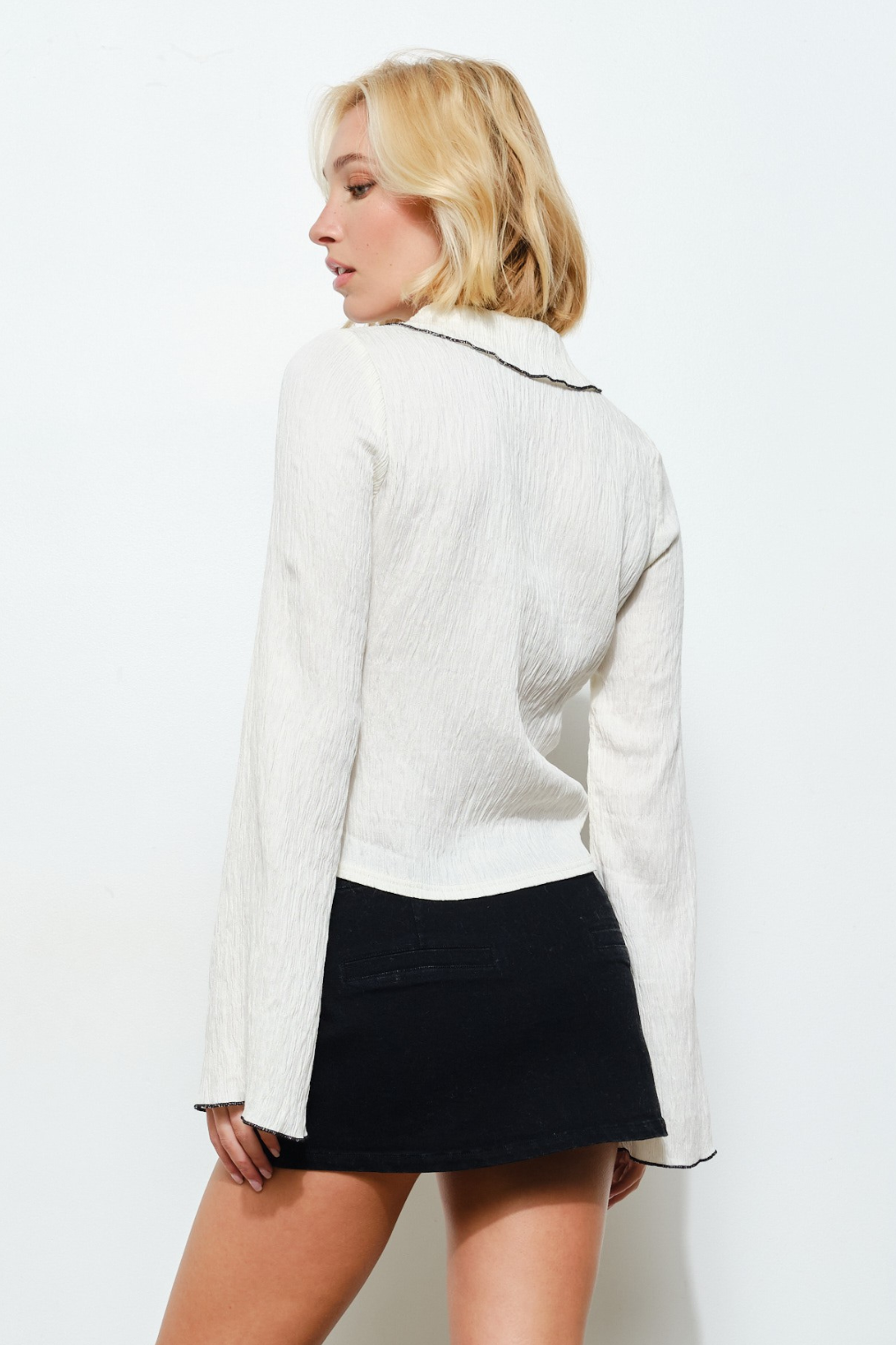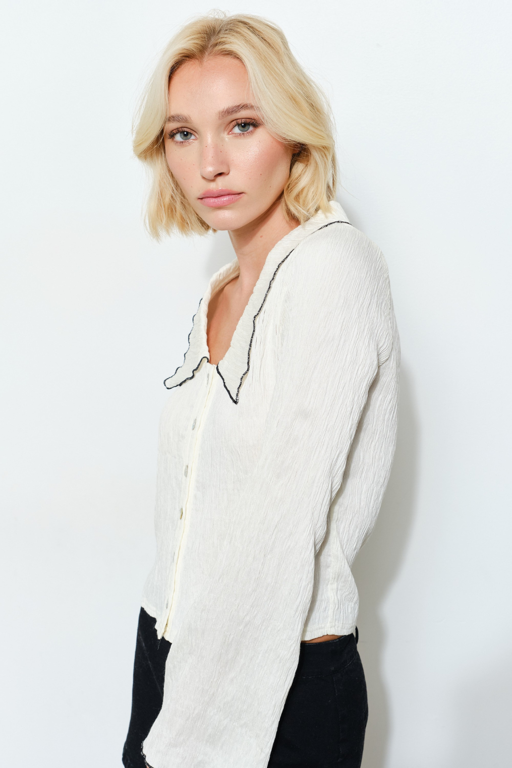 Boho-inspired button-up blouse with contrasting black stitch hem at the collar and cuffs.
