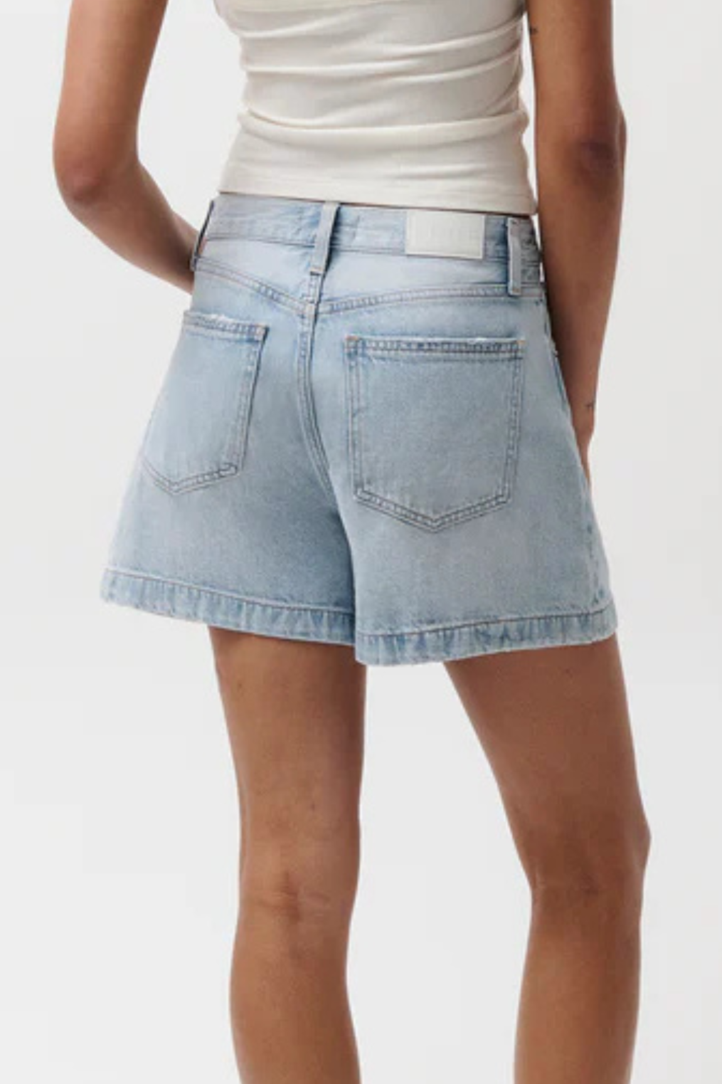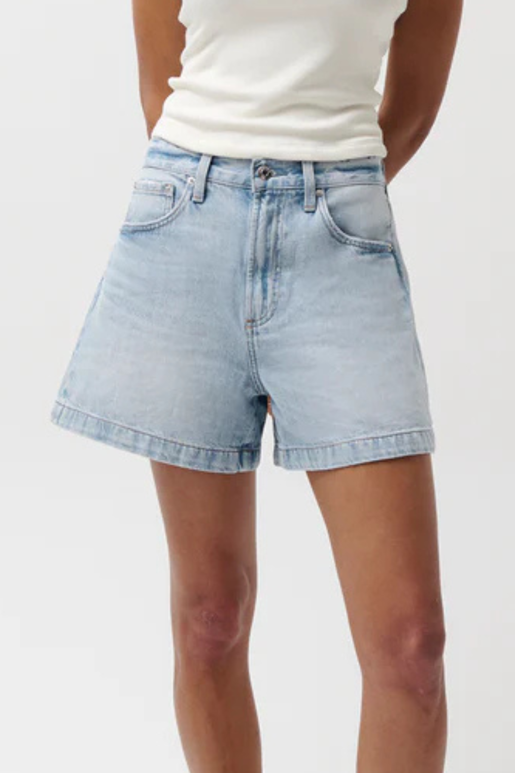 Classic rigid denim shorts in a bright wash with subtle fading.