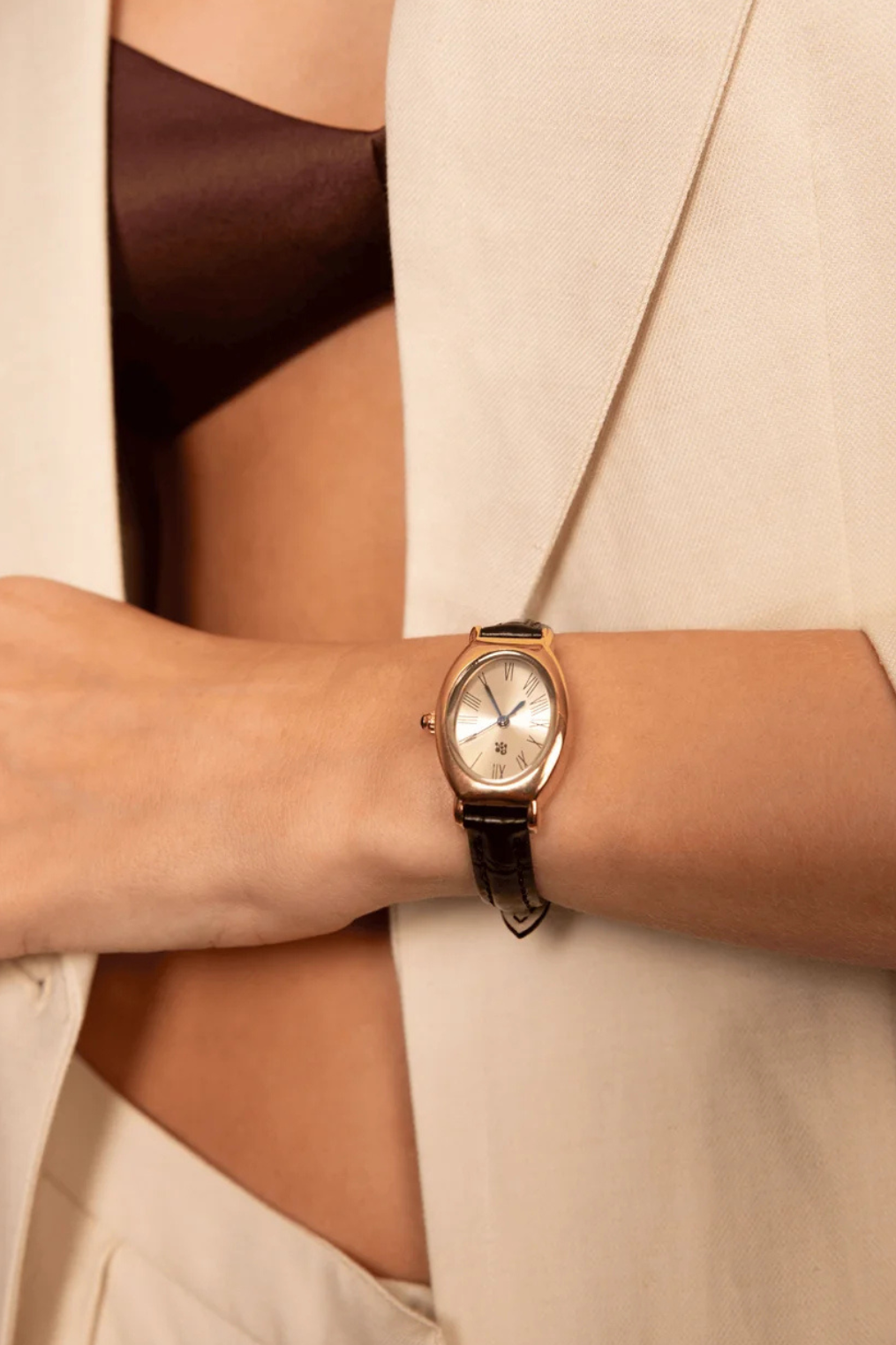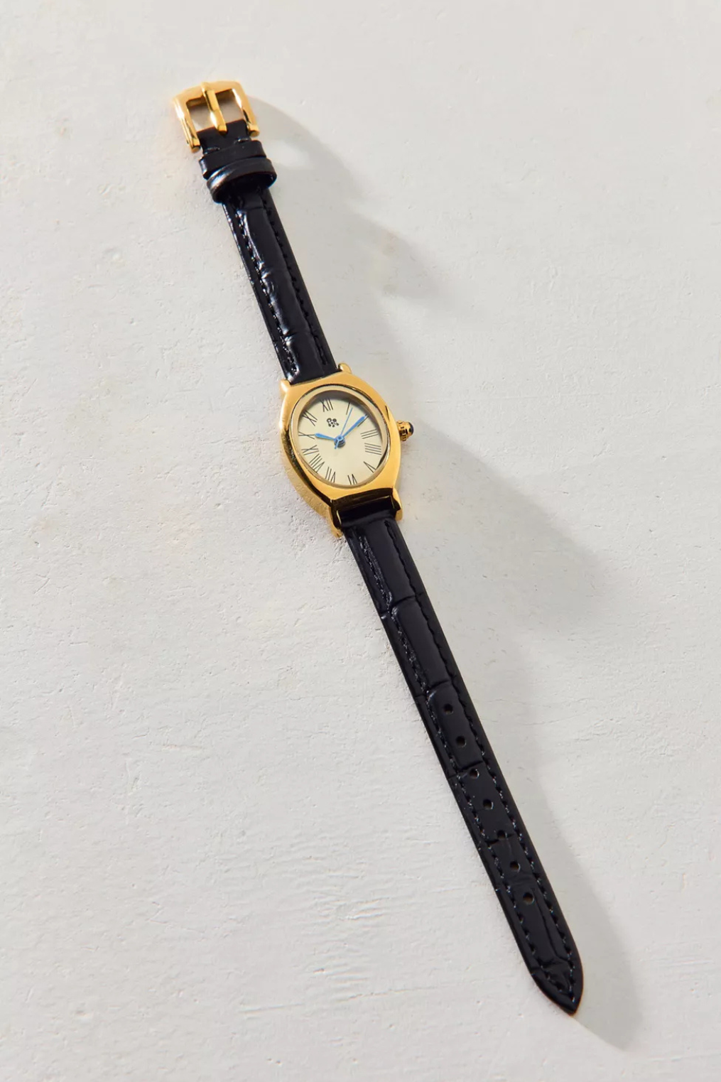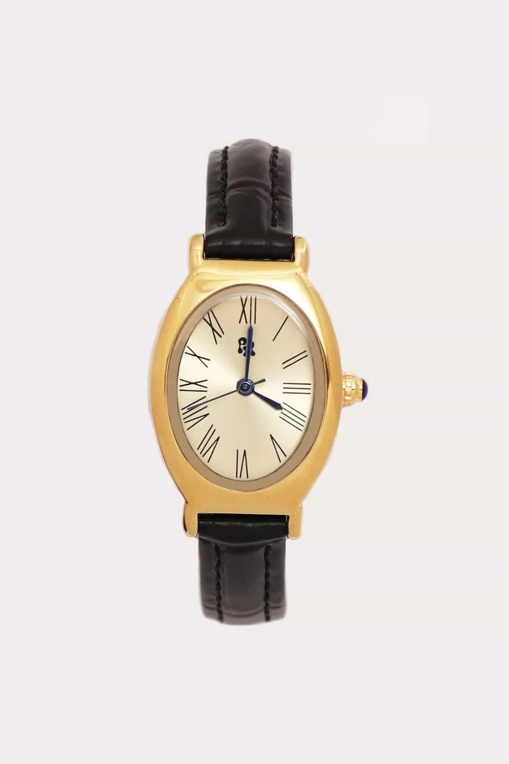 Classic gold oval-style watch with timeless Roman numerals face.