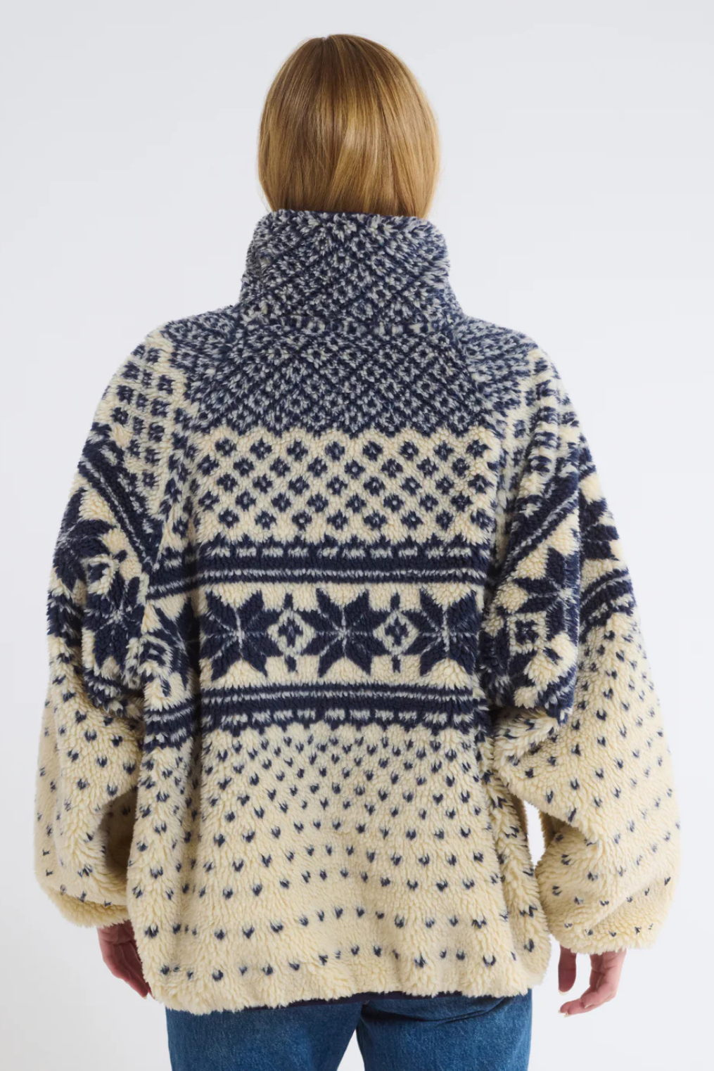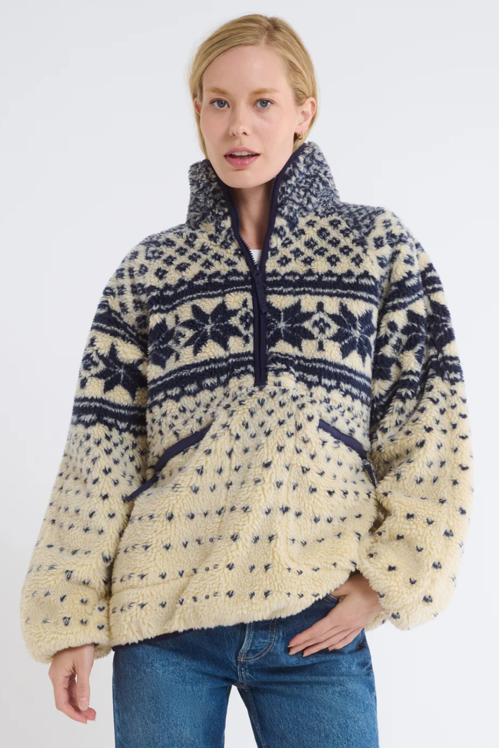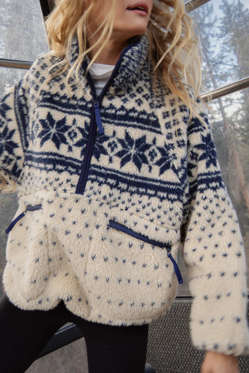 Cozy, oversized sherpa fleece pullover in a cream and navy blue fairisle snowflake motif.