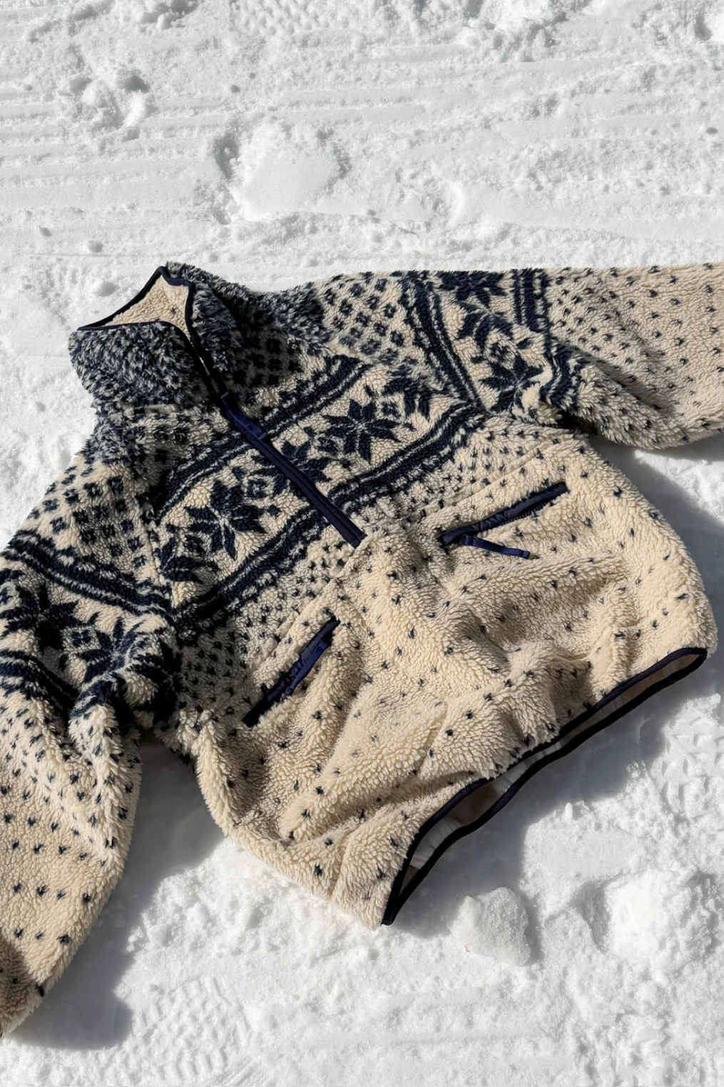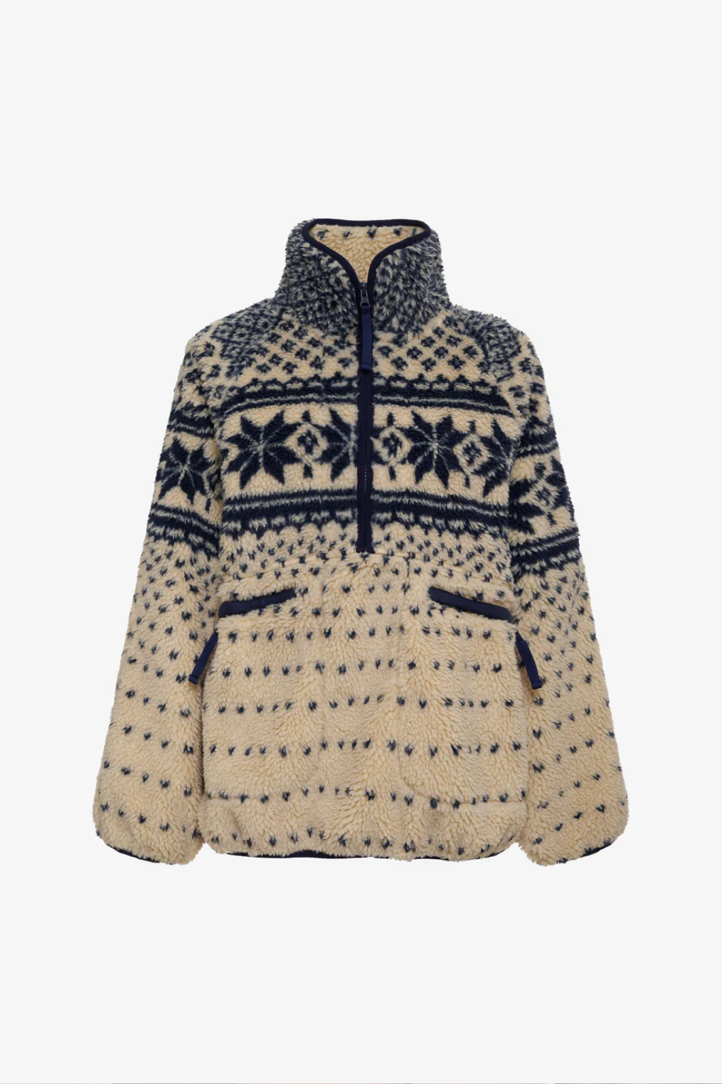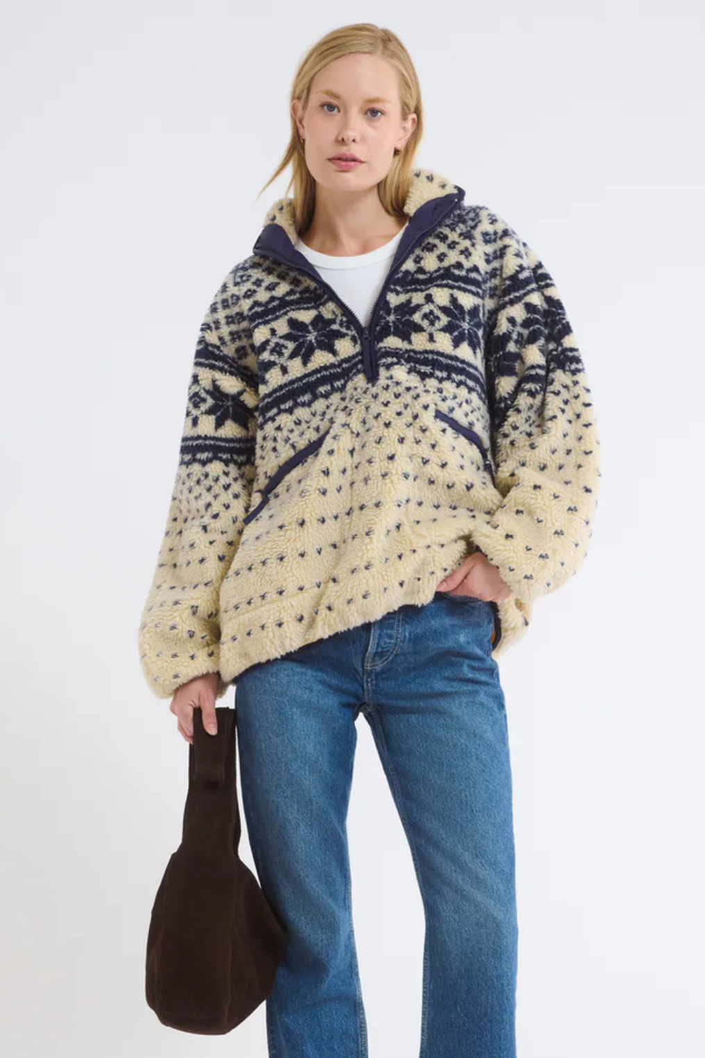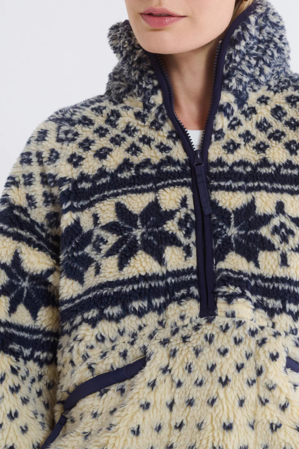 Cozy, oversized sherpa fleece pullover in a cream and navy blue fairisle snowflake motif.