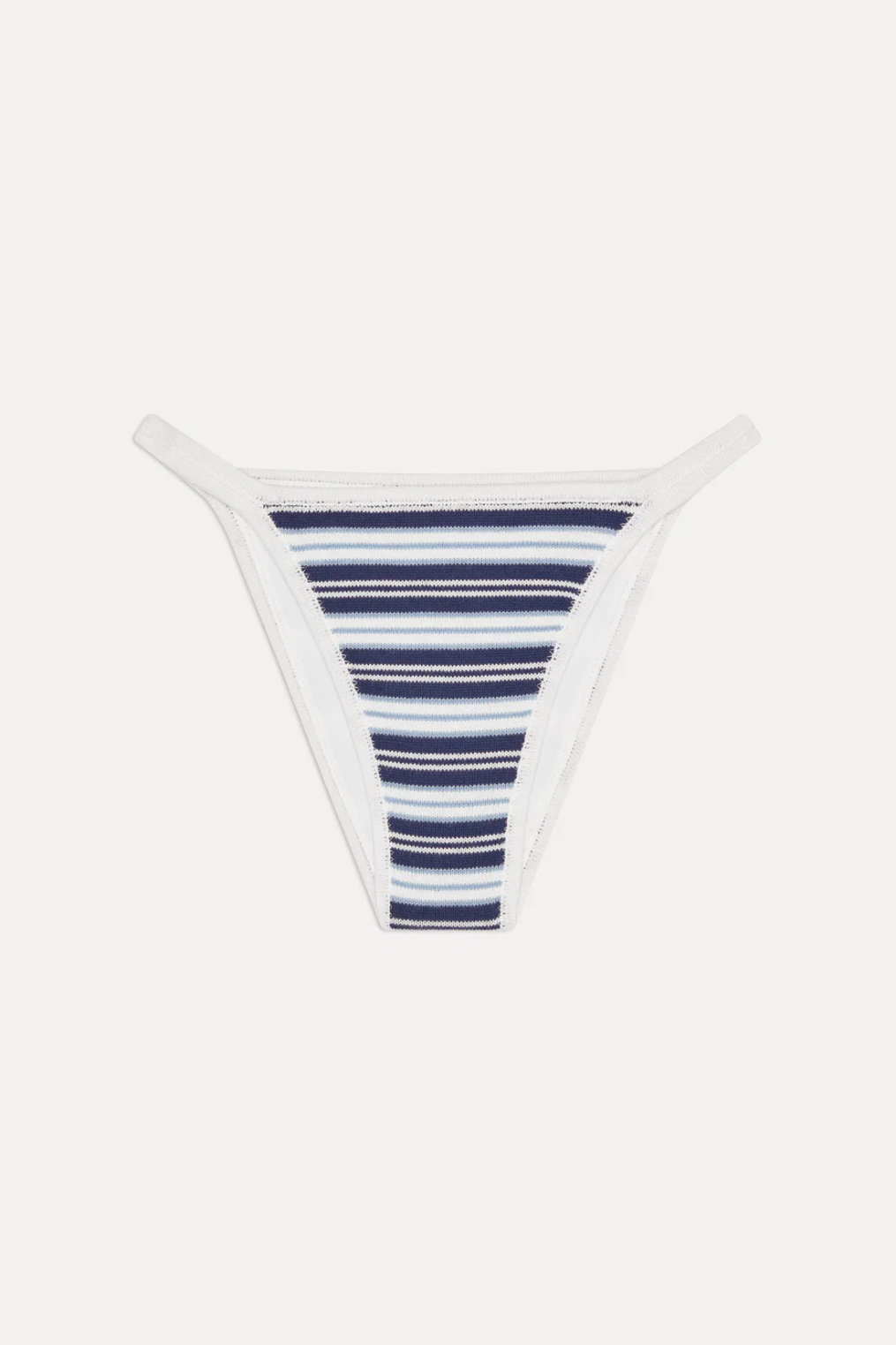 Blue and white striped knit bikini bottom.